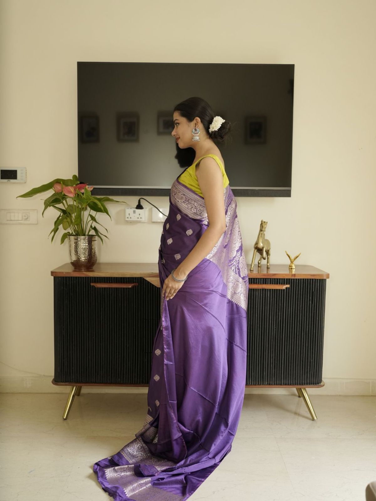 Crafted from authentic Banarasi silk, this striking purple saree exemplifies timeless elegance through its lustrous fabric and meticulously woven golden zari border. The rich hue combined with traditional craftsmanship creates a sophisticated drape, making it an ideal choice for weddings, celebrations, and formal occasions where refined taste is paramount.