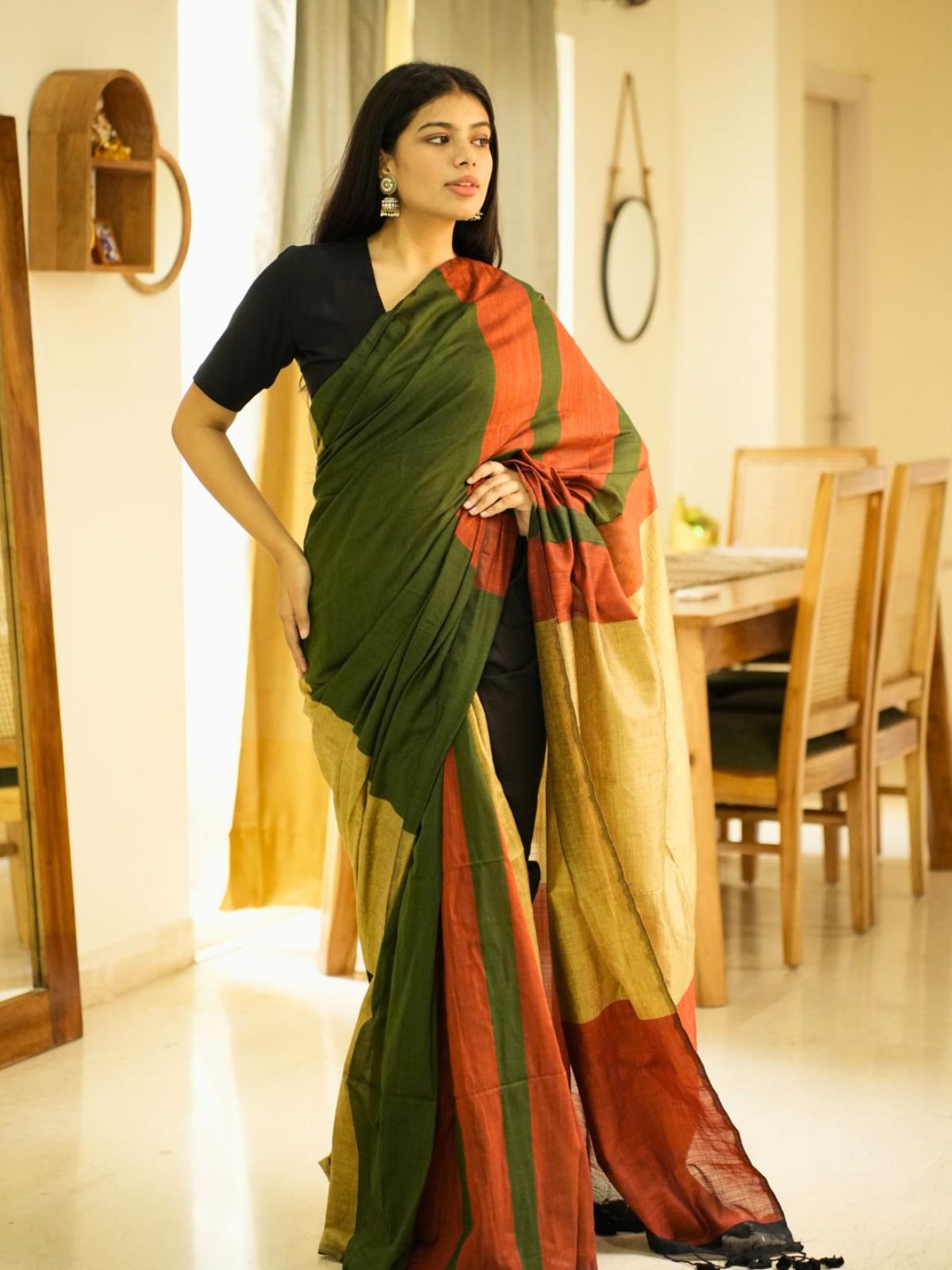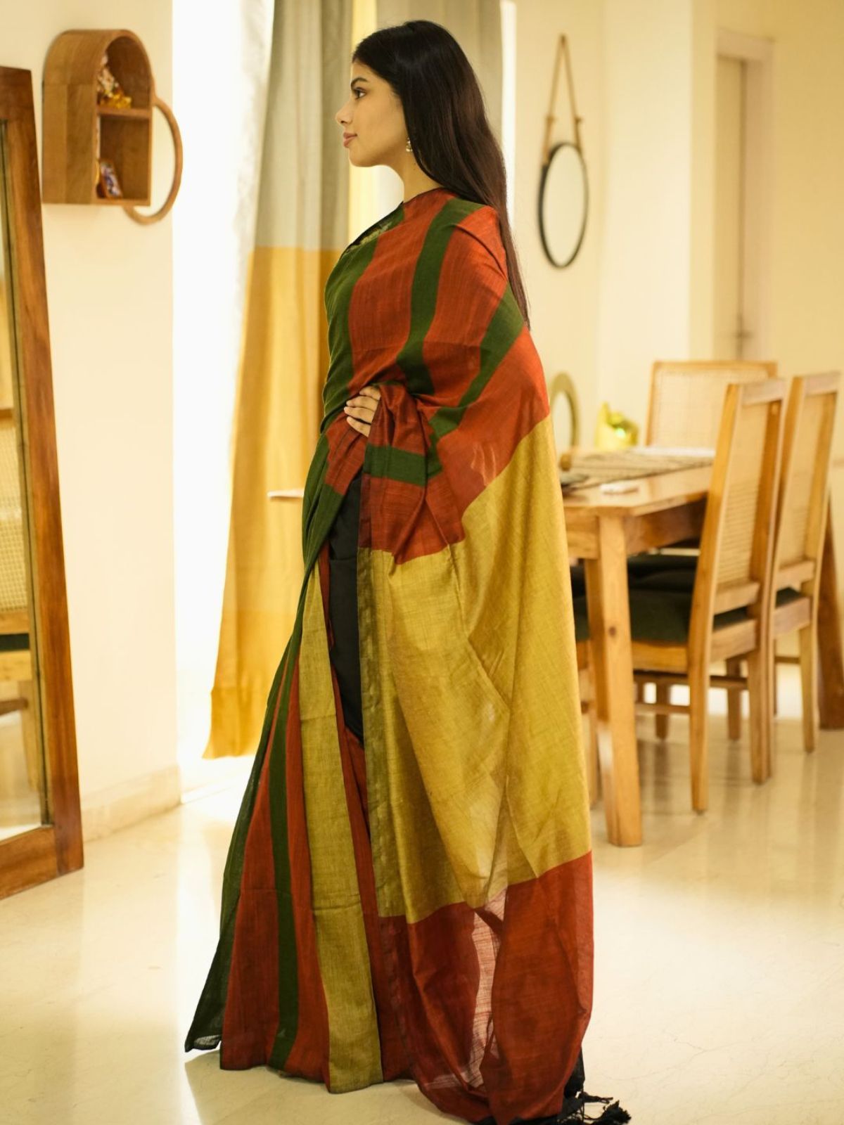 A handwoven cotton saree showcasing a vibrant spectrum of colours, this piece honours traditional craftsmanship while embracing contemporary aesthetics. The intricate weaving technique and dynamic colour palette make it a versatile choice for both festive occasions and everyday elegance.