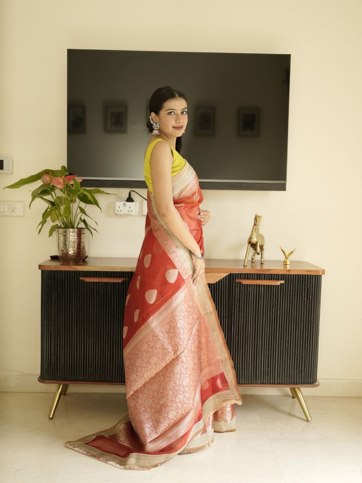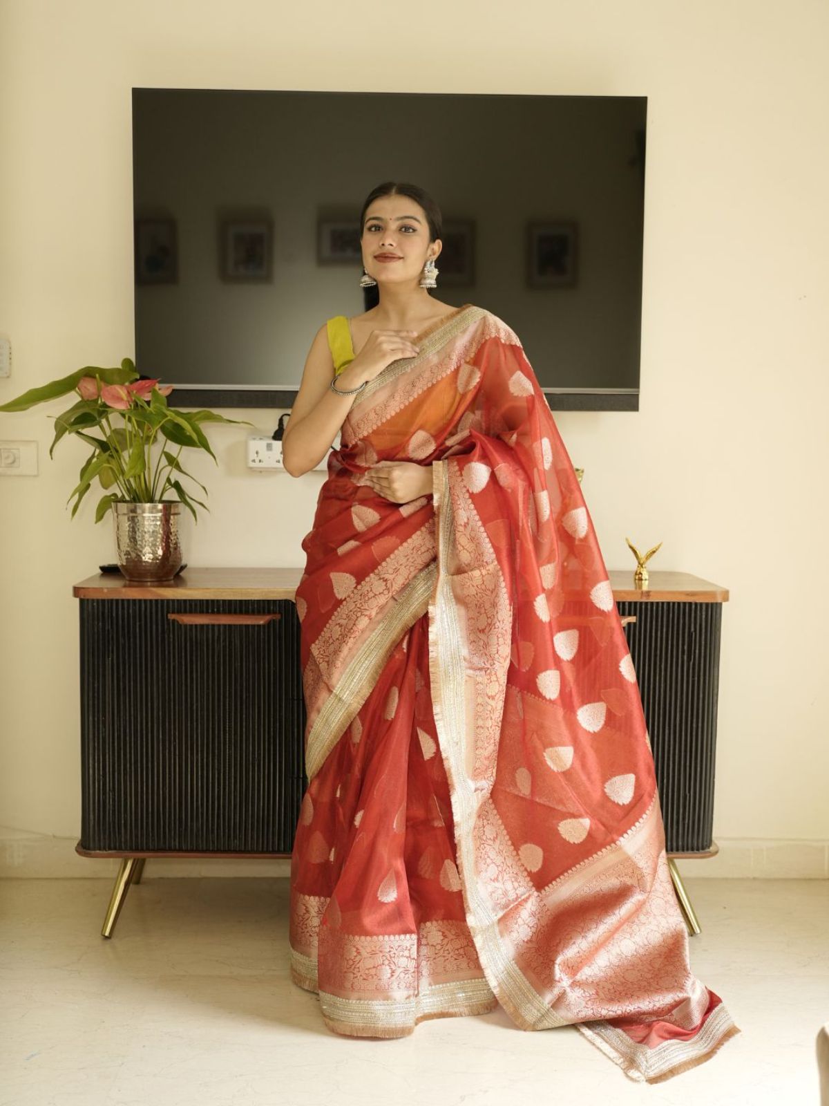 A stunning red Banarasi saree featuring an intricate golden zari border that epitomizes traditional Indian craftsmanship. This timeless piece seamlessly transitions from celebrations to special occasions, offering the perfect blend of heritage elegance and sophisticated style.