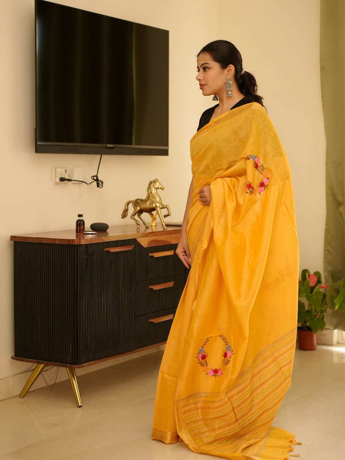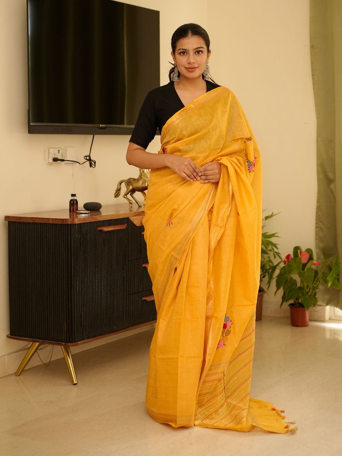 Crafted from premium linen, this mustard-hued saree features an ornate zari border and delicate floral embroidery that elevates its understated elegance. The warm, golden tone complements a range of skin tones while the natural fabric ensures breathability and comfort. Perfect for both festive occasions and refined everyday wear, this piece combines traditional craftsmanship with contemporary sensibility.