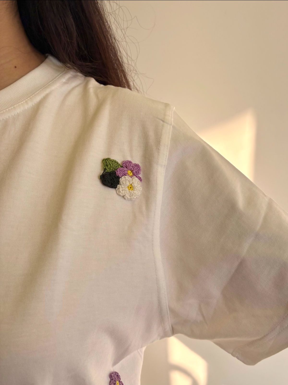 Discover understated sophistication with this white cotton tee, distinguished by meticulously hand-crocheted botanical embellishments. Each delicate flower and leaf motif is individually crafted, infusing artisanal character into a timeless wardrobe essential. Constructed from premium breathable cotton, the relaxed silhouette delivers all-day comfort without compromising on refined aesthetics. This piece exemplifies the intersection of wearable art and practical design—a testament to thoughtful craftsmanship made in India.