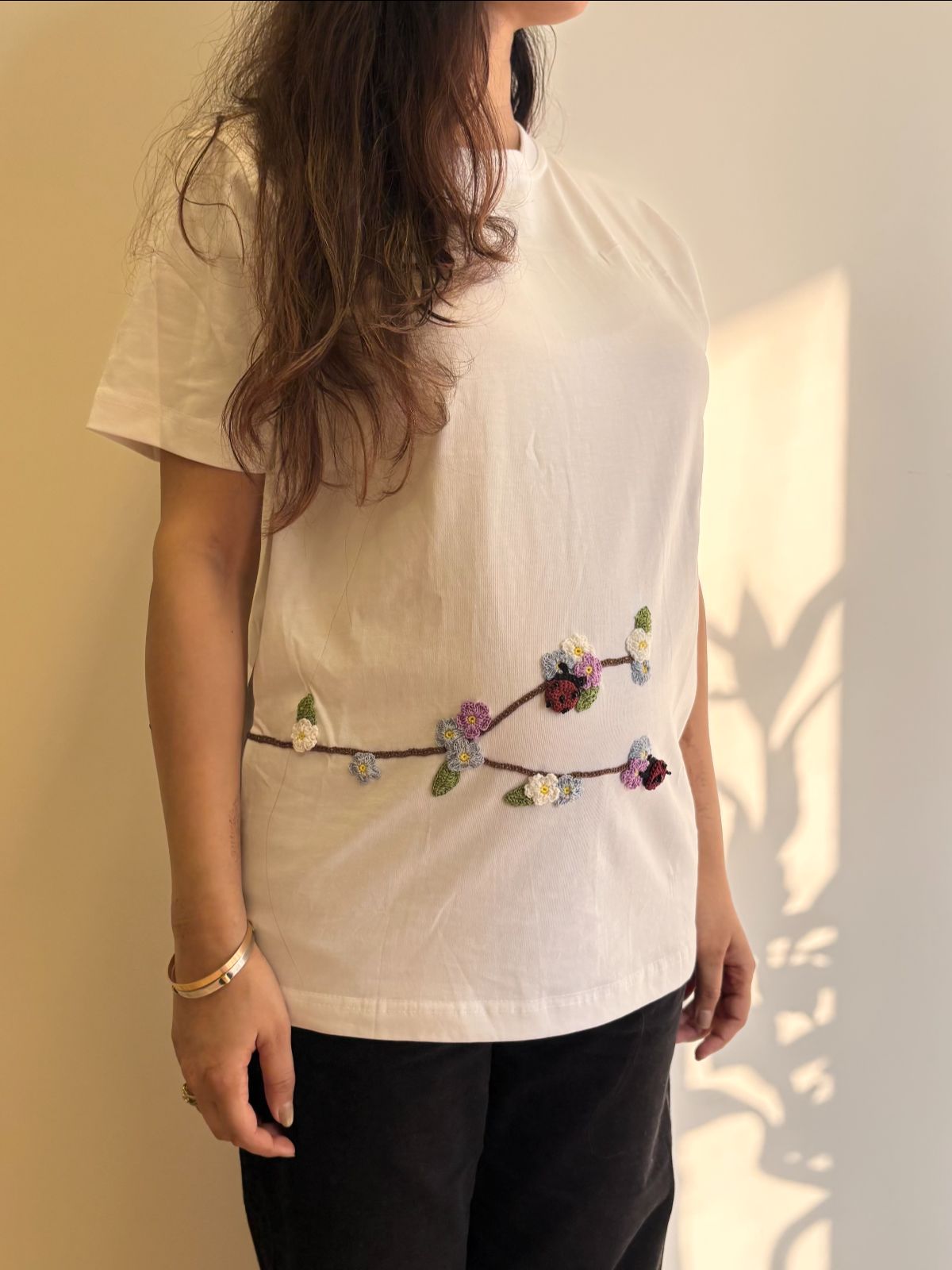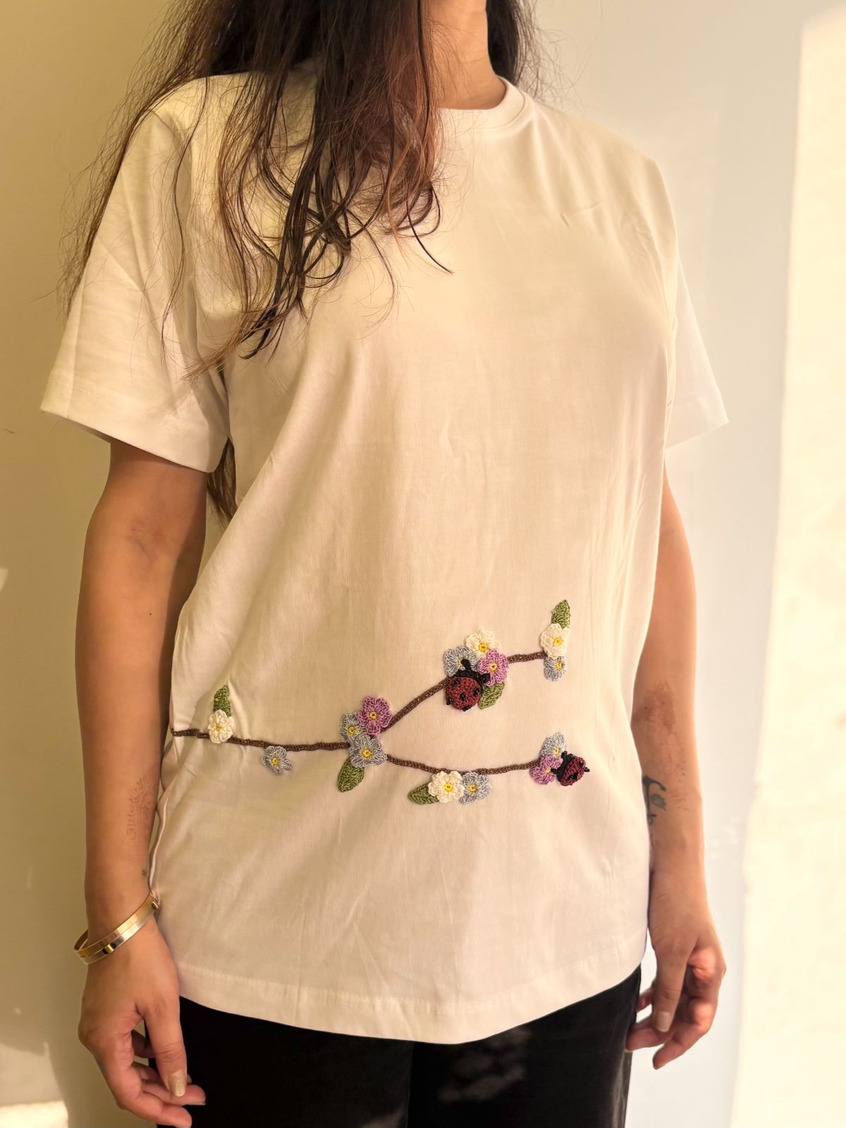 Discover understated sophistication with this white cotton t-shirt, distinguished by meticulously hand-crocheted botanical embellishments. Each delicate flower and leaf motif is individually crafted, infusing artisanal character into a versatile wardrobe essential. Constructed from premium breathable cotton, the relaxed silhouette ensures all-day comfort without compromising on refined aesthetics. This piece exemplifies the intersection of traditional craftsmanship and contemporary minimalism—a thoughtfully designed garment that transcends seasonal trends.