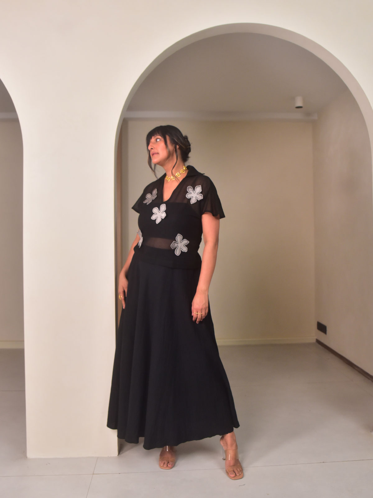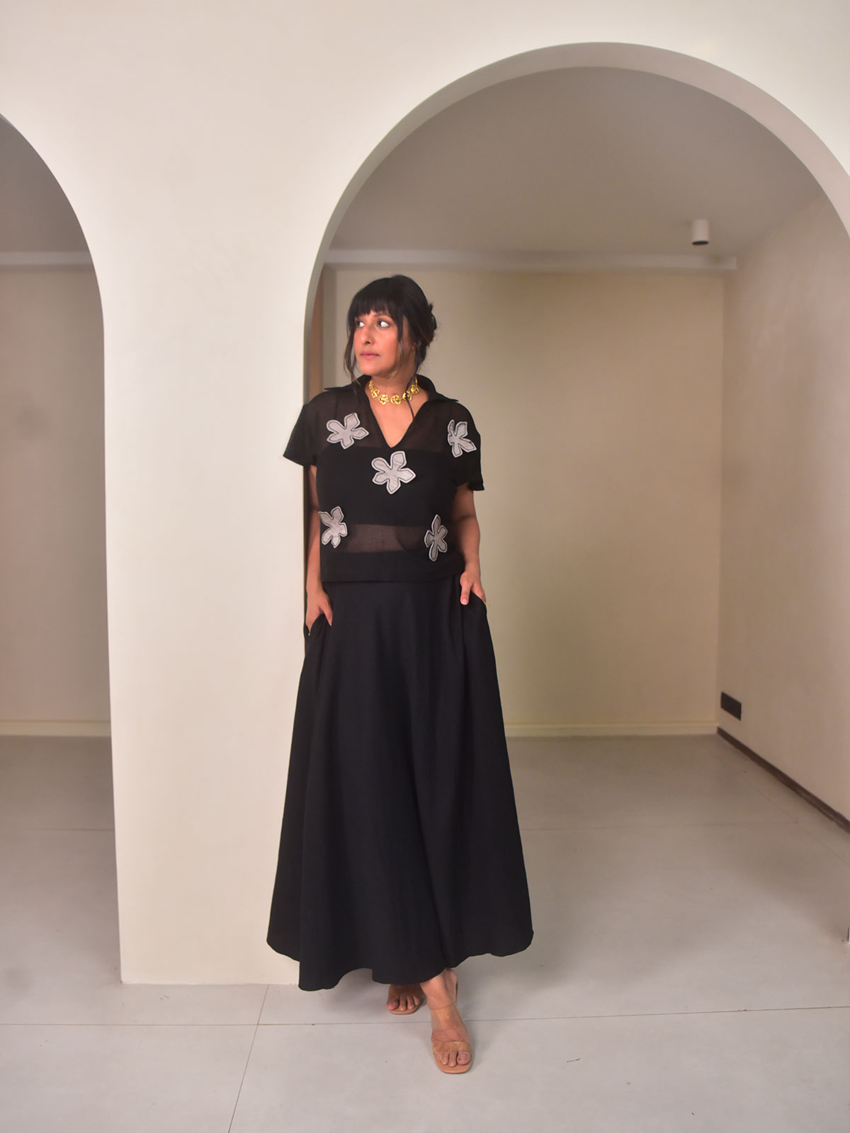 This elegant set features a cropped black cotton net top with handcrafted floral applique, classic collars, and back tie-ups for adjustable shaping, paired with a flowing black cotton linen umbrella skirt. The skirt elasticated waist ensures comfort while offering beautiful movement and flare. Ideal for festive evenings, celebrations, or special occasions. Style with minimal heels and statement accessories for a striking yet effortless ensemble.