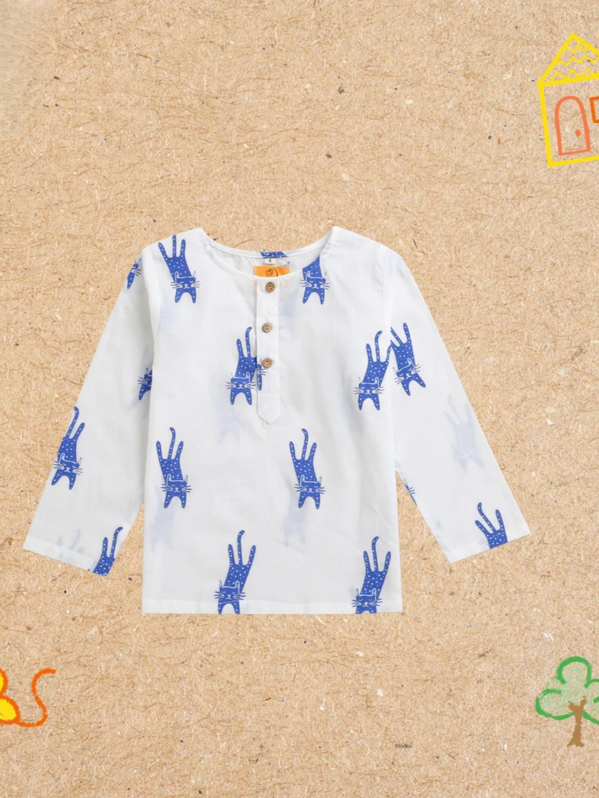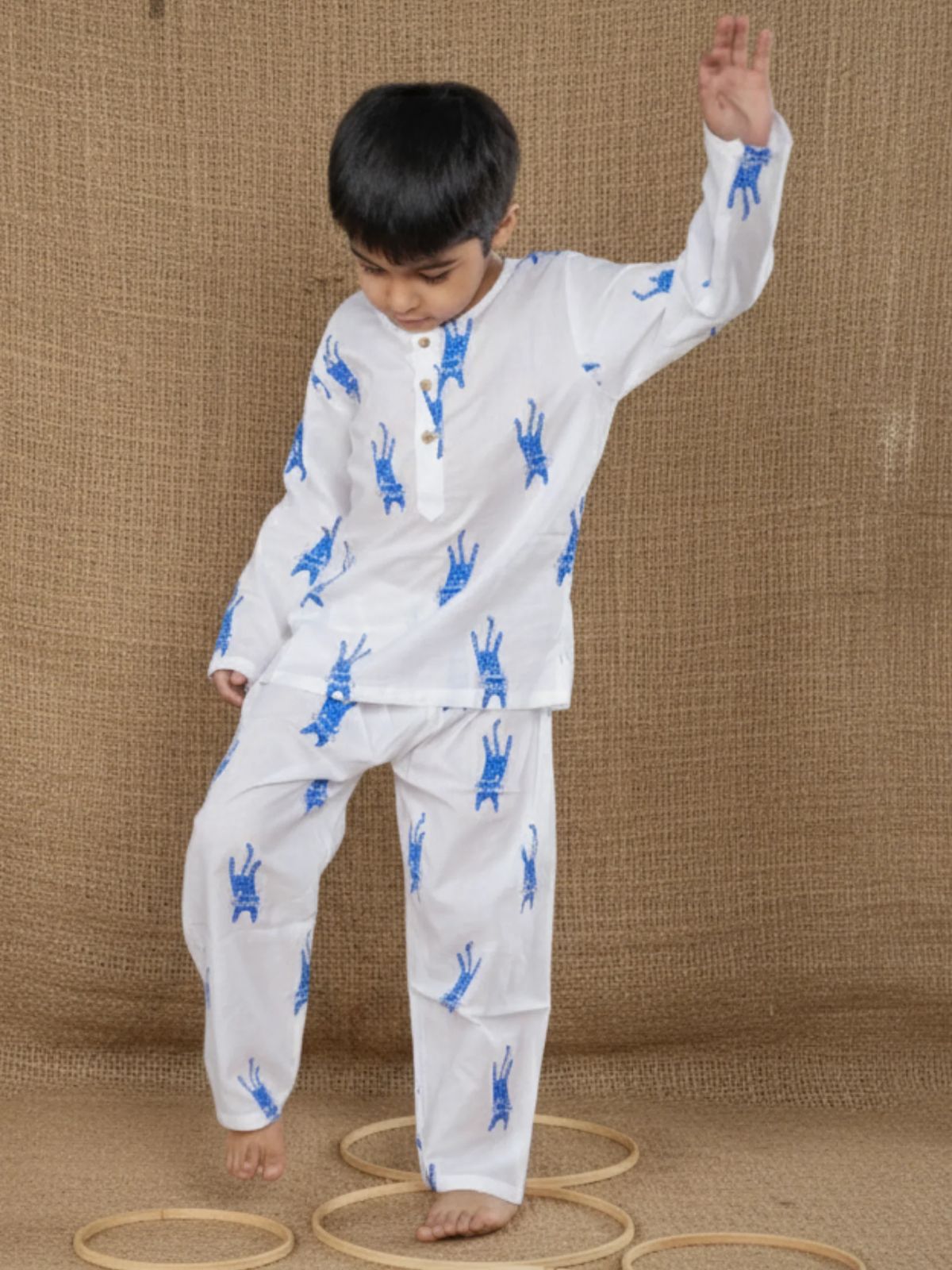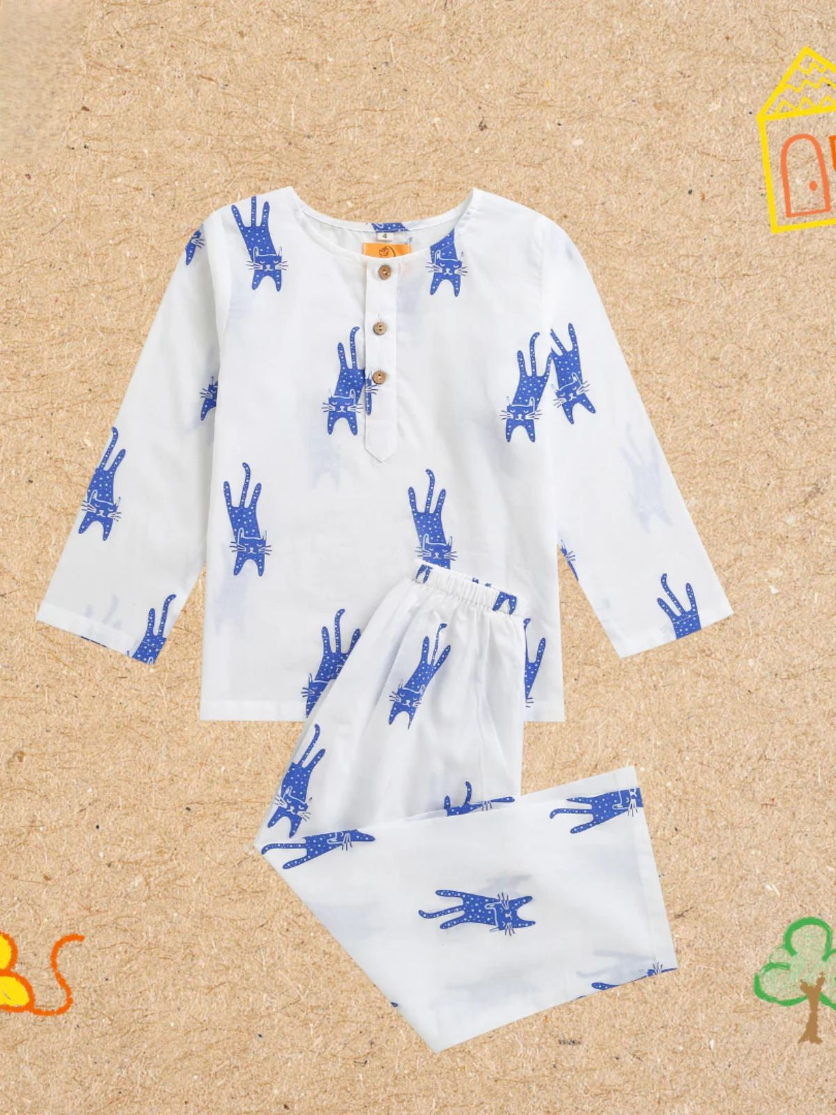 Designed with premium cotton that prioritizes comfort and breathability, this unisex nightwear set delivers the softness children need for undisturbed sleep. The charming feline motif transforms bedtime into an engaging experience, while the button-front shirt and elasticated waistband provide practical ease for dressing and movement. Crafted from chemical-free, child-safe materials and available across sizes 6 months to 8 years, this piece combines playful design with functional comfort. The relaxed silhouette suits all children equally, making it an ideal choice for everyday wear or special occasions. Each hand screen-printed piece carries subtle variations that celebrate its artisanal quality.