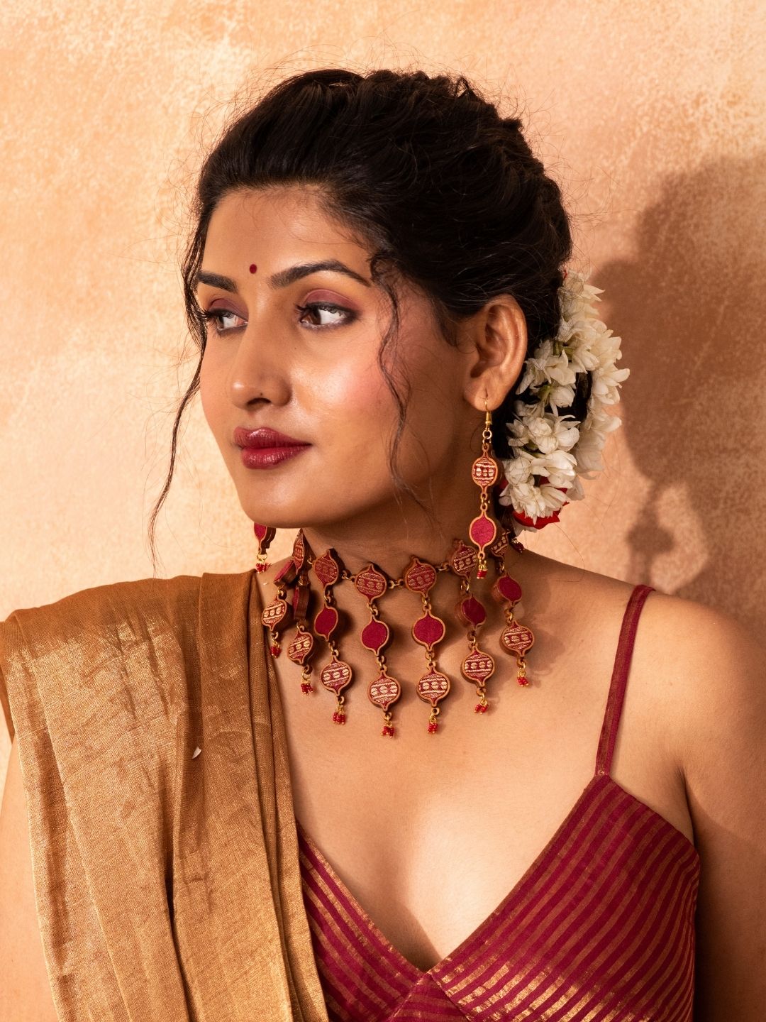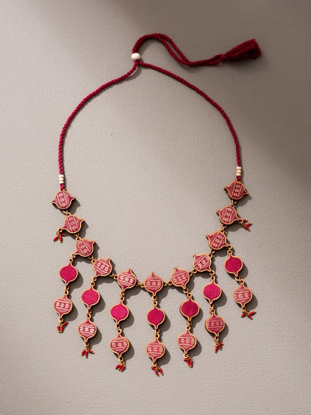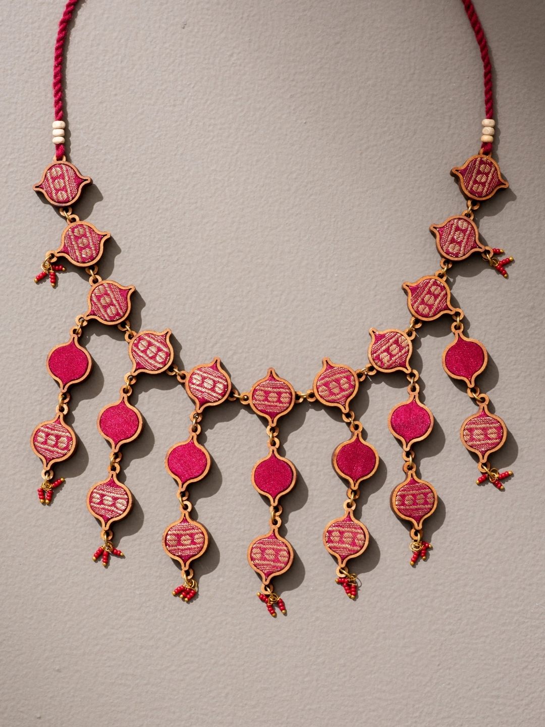 Embrace sustainability at its core with the Red and Gold Multi-Layered Upcycled Fabric and Repurposed Wood Necklace. Crafted in India, we breathe new life into discarded fabric waste and compressed wood dust, turning them into elegant jewelry. Make a stylish, eco-conscious statement and embrace a greener world with pride.
