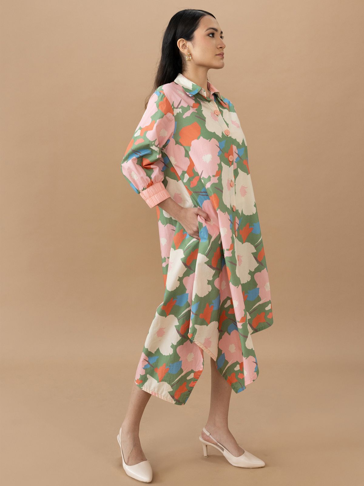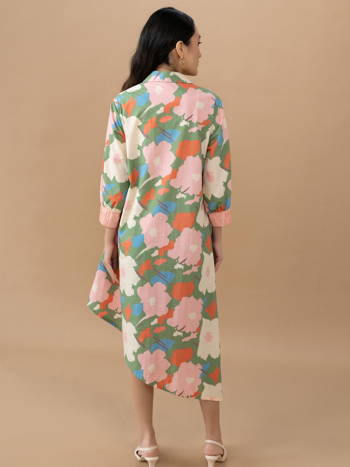 The Hazel Shirt Dress in abstract floral olive is a perfect blend of classic design and modern details. Made from lightweight cotton poplin, this shirt dress features an asymmetrical hemline that adds a contemporary touch to its relaxed, fit-and-flare silhouette. The abstract floral print brings a fresh, making it a versatile piece for daywear or casual occasions.