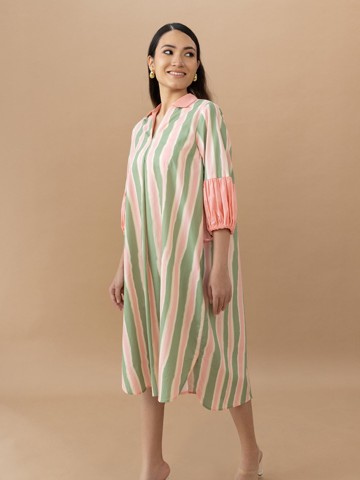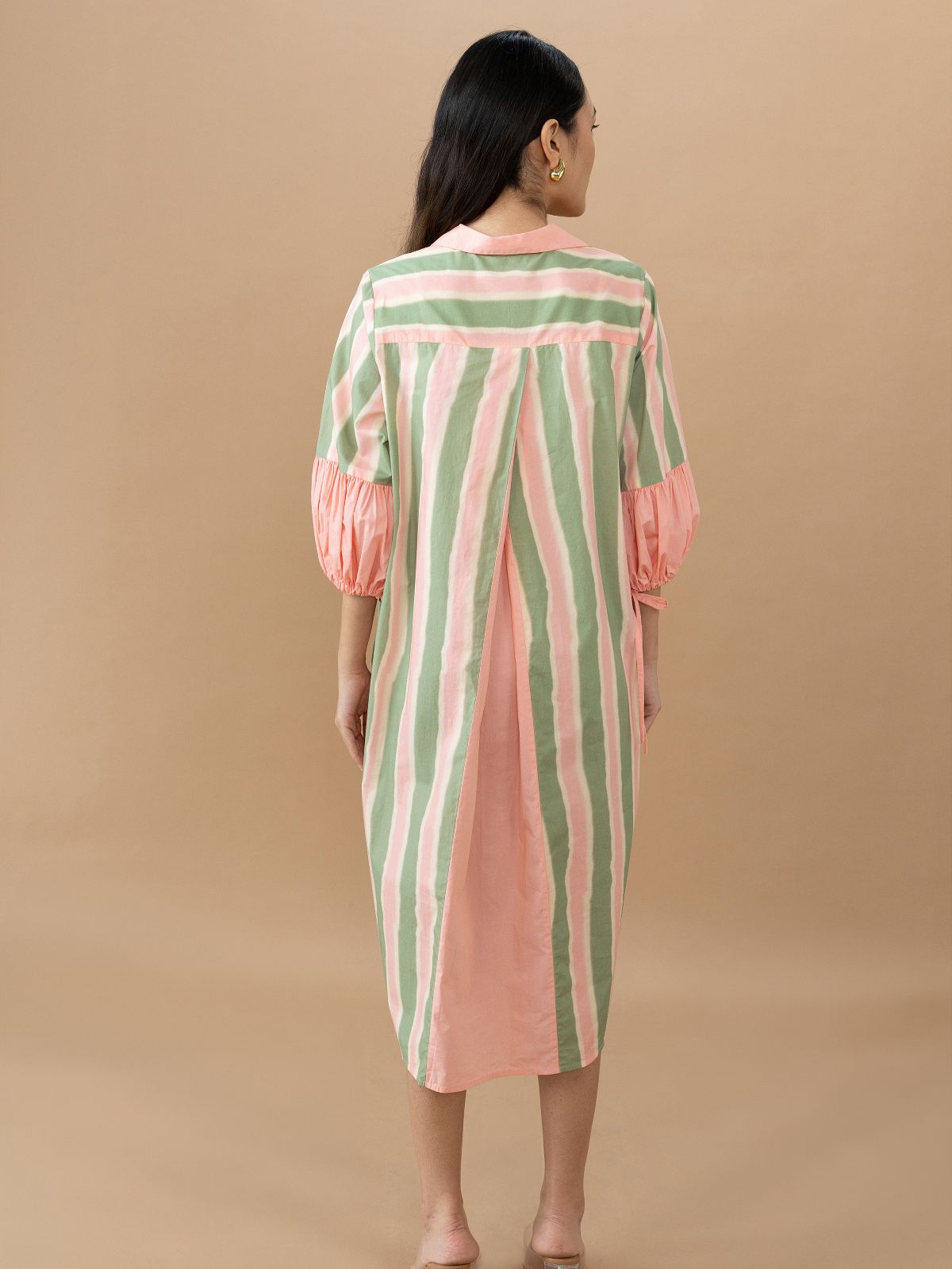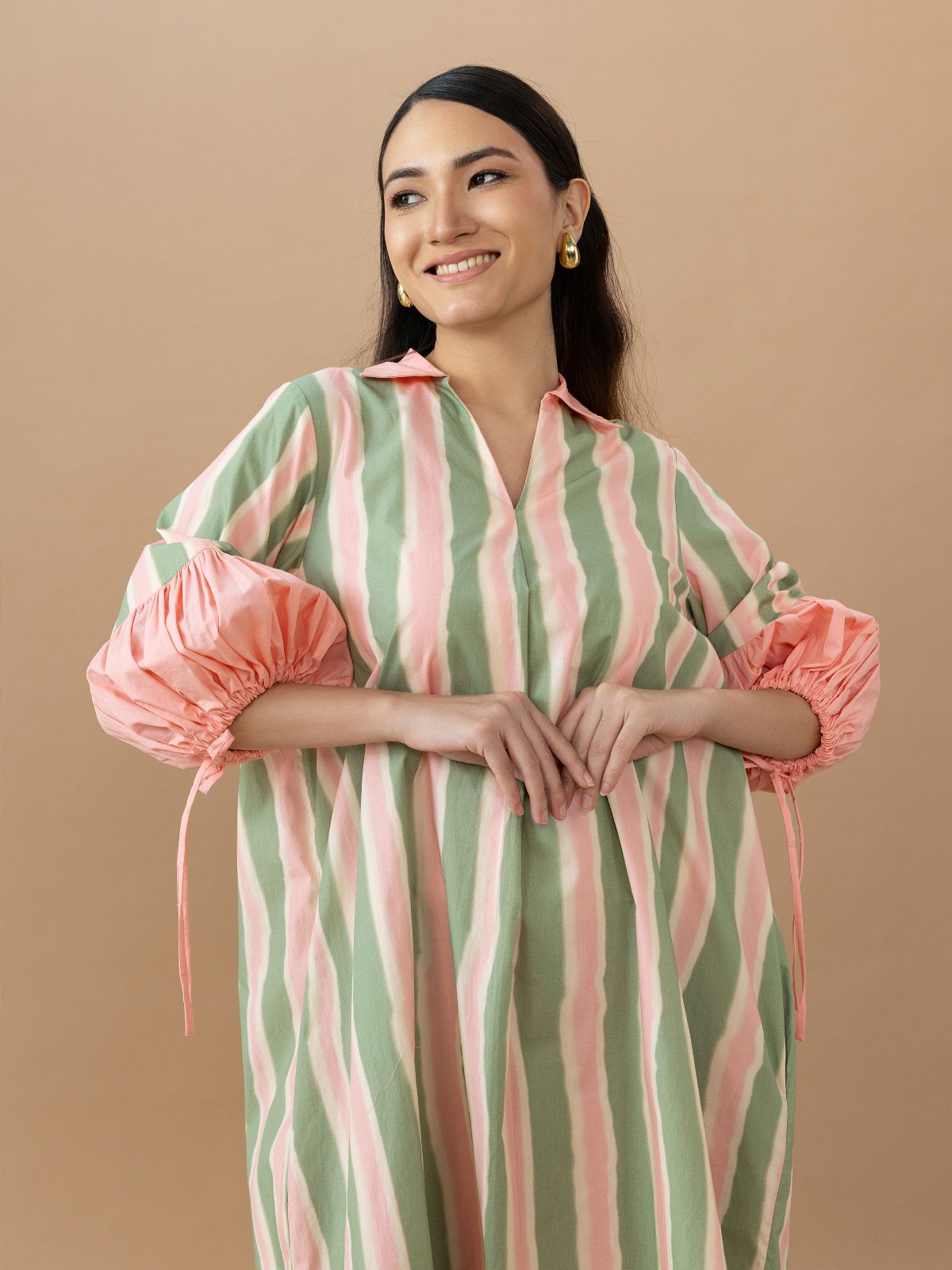 Expertly designed and exquisitely crafted, the Jaden Dress in Olive Stripes offers a sophisticated and modern look. The A-line design and gathered sleeves create a flattering silhouette, while the back detailing adds a touch of elegance. Elevate your style with this must-have dress.