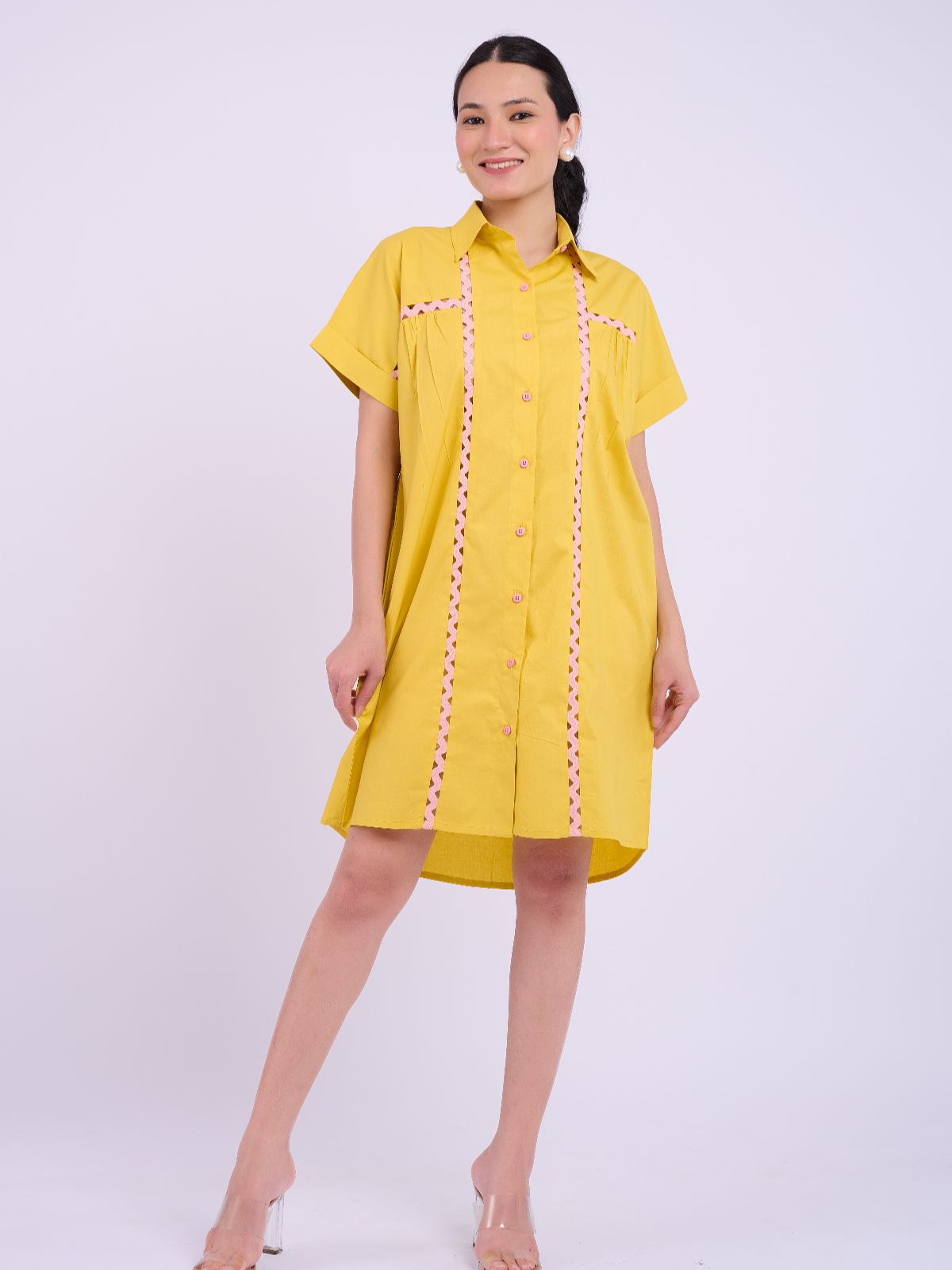 Say hello to sunshine styling with the Jordan Dress — a cheerful shirt dress crafted in bright yellow cotton poplin. Featuring soft pleats, playful pink lace details, and a breezy silhouette, this dress brings a fresh burst of color and comfort to your day. Easy to style and effortlessly flattering, it’s perfect for warm-weather brunches, casual Fridays, or weekend strolls.