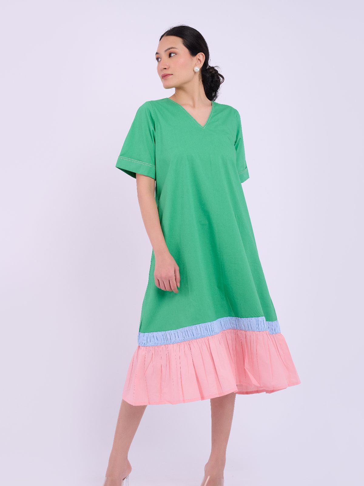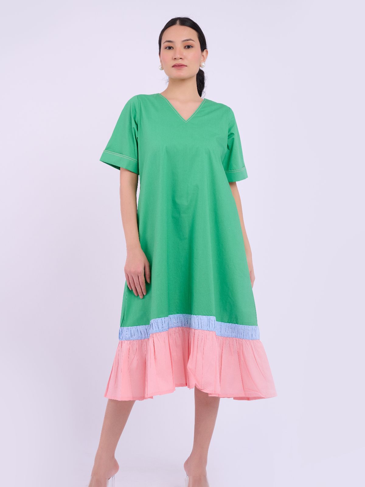 Bright, breezy, and full of charm — the Mira Dress is your go-to midi for summer ease. Crafted in breathable dark green cotton poplin, this dress features a flattering V-neckline, soft short sleeves, and a tiered hem in contrasting hues of sky blue and blush pink. Finished with a sky blue fabric belt to define the waist, Mira is perfect for brunches, vacations, and everything in between.