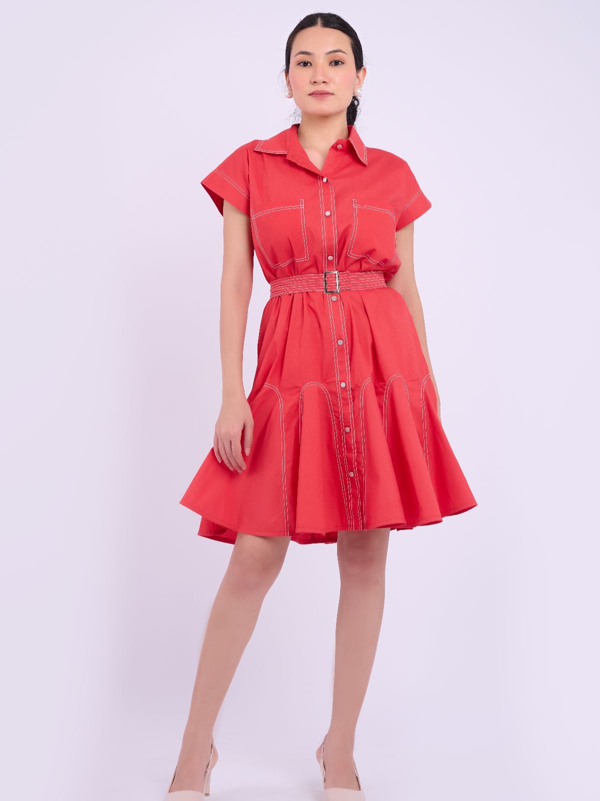 Bold yet timeless, the Sasha Dress in Berry Red is crafted in premium cotton poplin with contrast stitch detailing and a structured silhouette. The belted waist and flared hem offer a flattering fit — perfect for everyday elegance or a statement day out.