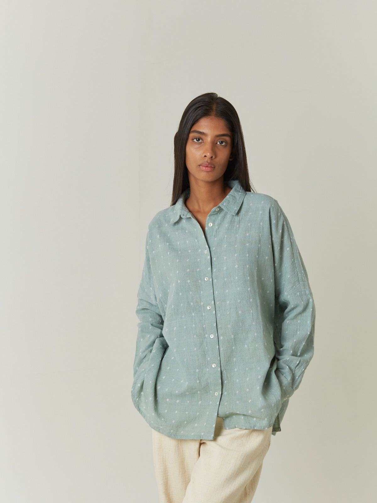 Discover the unique charm of our Sage shirt, crafted from 100% handwoven Kala cotton for a breathable and comfortable feel. This special piece stands out with a striking contrast back yoke featuring an authentic bandhani design. The intricate Bandhani tie-dye work was skillfully done in Bhuj, Gujarat, a testament to traditional Indian artistry. Following this, the garment was meticulously dyed with Azo-free dyes in Bengaluru..
