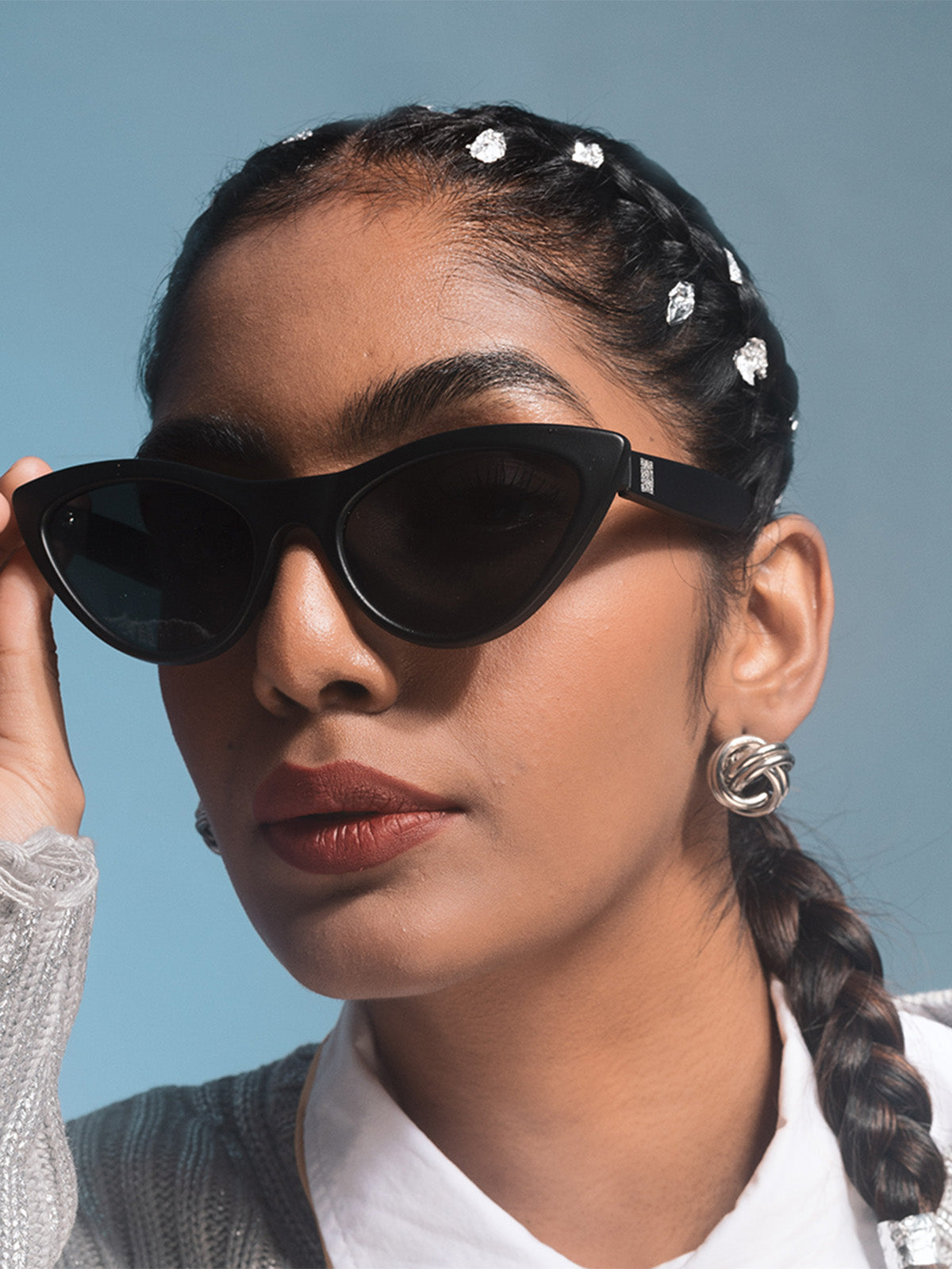 These sunglasses boast a chic cateye design, accentuated by a matte black finish. Additionally, they feature standard lenses with the darkest shade for optimal protection, all while maintaining a lightweight feel on the face.