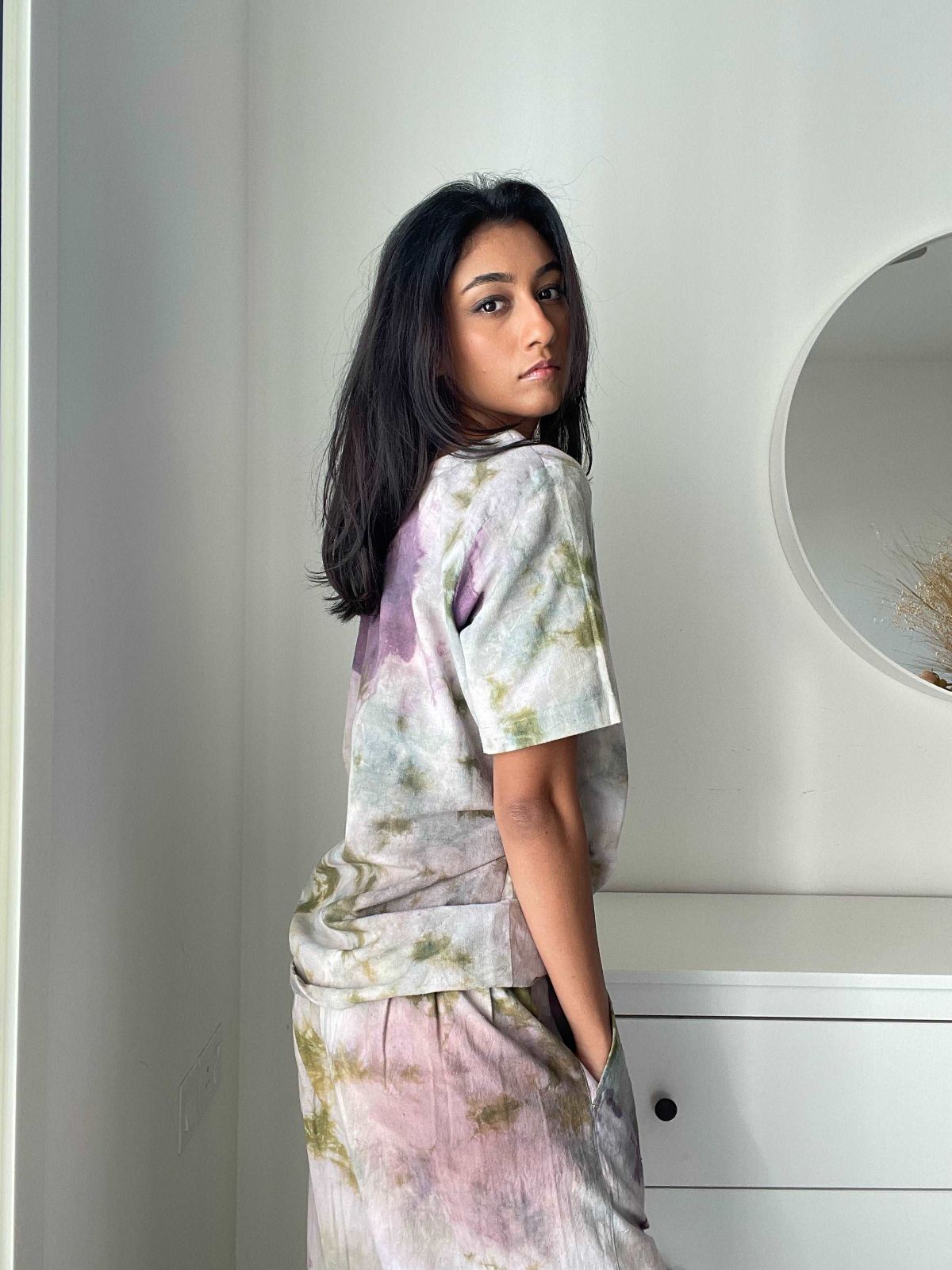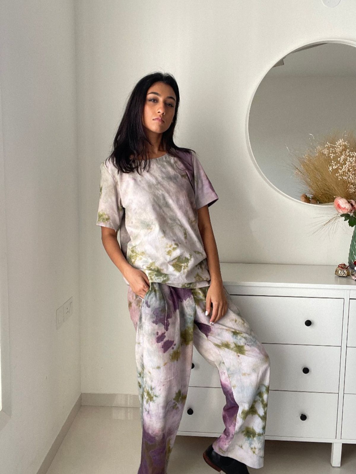 Crafted from a cotton-linen blend, this tee delivers exceptional comfort and breathability across all seasons. The fabric's natural dye process produces distinctive marble-effect hues that distinguish it from conventional garments. Layer it with complementary pieces from our collection to create a cohesive, environmentally conscious wardrobe that reflects both style and sustainability values.