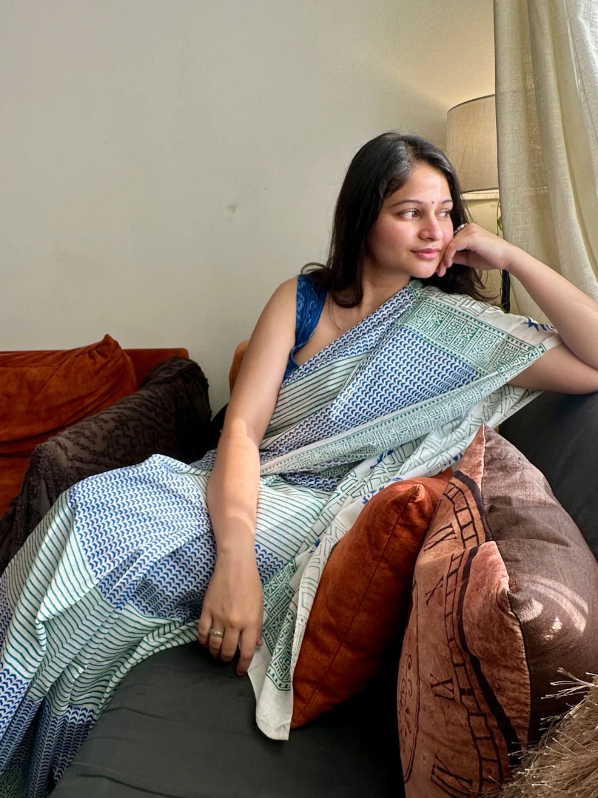 Elevate your everyday style with this blue-green printed mul cotton saree, crafted for women who love comfort with a touch of charm. The soothing white base with hand-block-inspired geometric patterns adds a modern twist to traditional drapes. Made from super soft and breathable mul cotton, it’s perfect for office wear, casual outings, or relaxed brunch days. Its lightweight texture ensures you stay cool and comfortable all day long while looking effortlessly elegant.