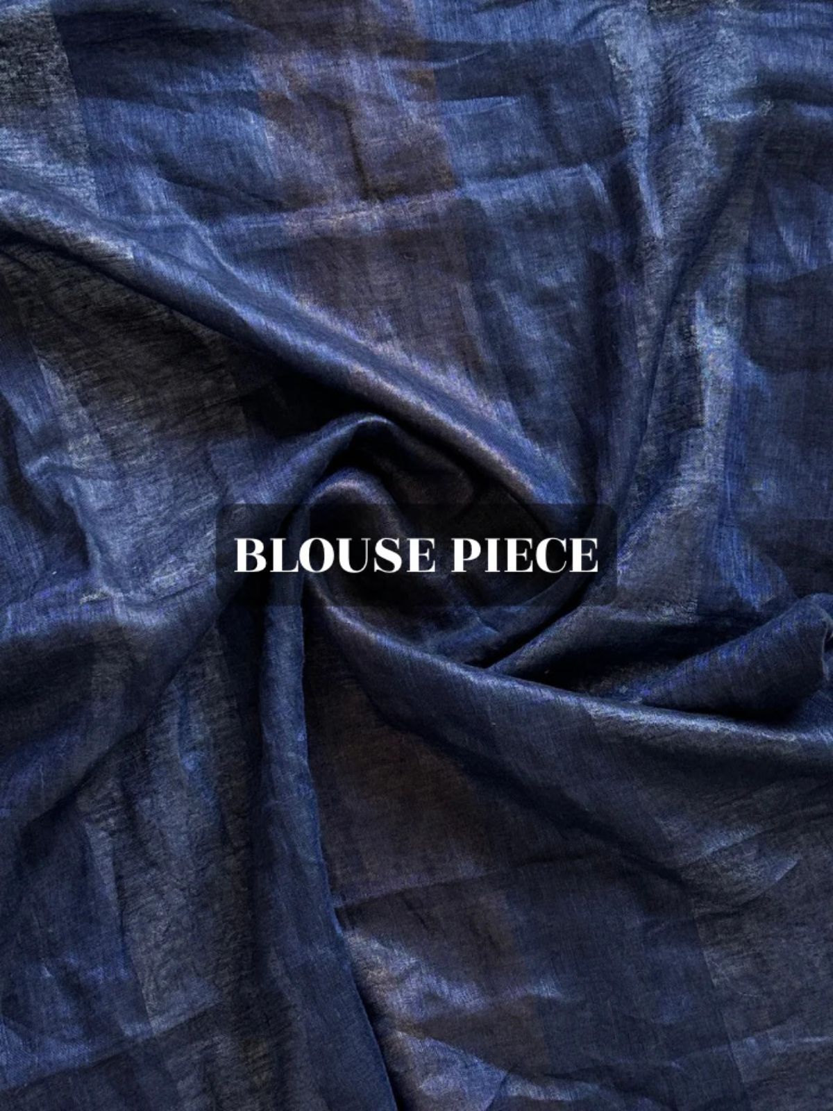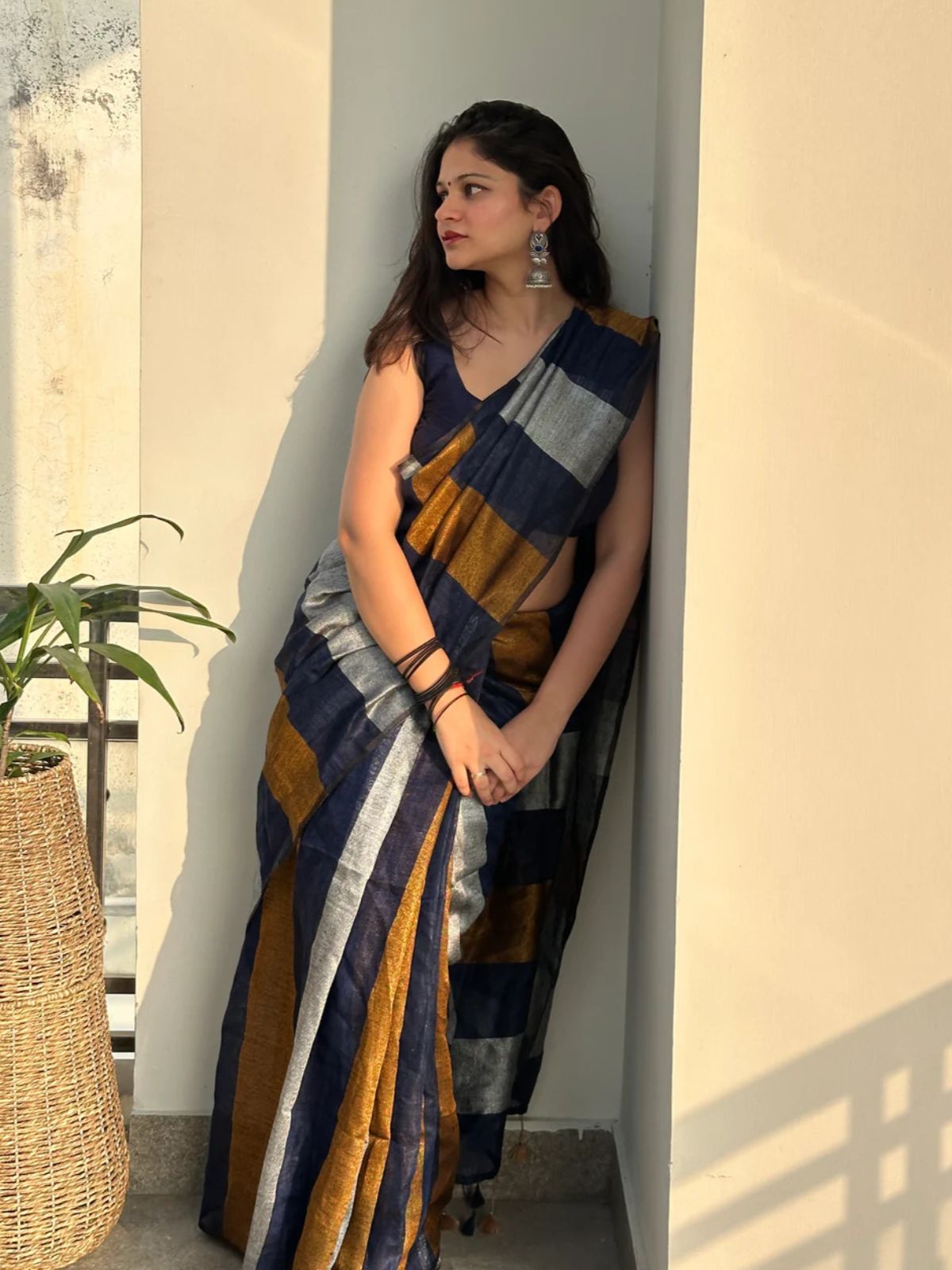 This navy-blue linen saree with metallic silver and gold stripes is the perfect mix of traditional craft and modern elegance. The rich contrast of deep tones and shimmer gives it a statement look that’s ideal for festive evenings or special celebrations. Lightweight and breathable, it drapes beautifully while keeping you comfortable. Pair it with oxidised jewellery or golden accents - it’s a saree that speaks confidence and charm in equal measure.