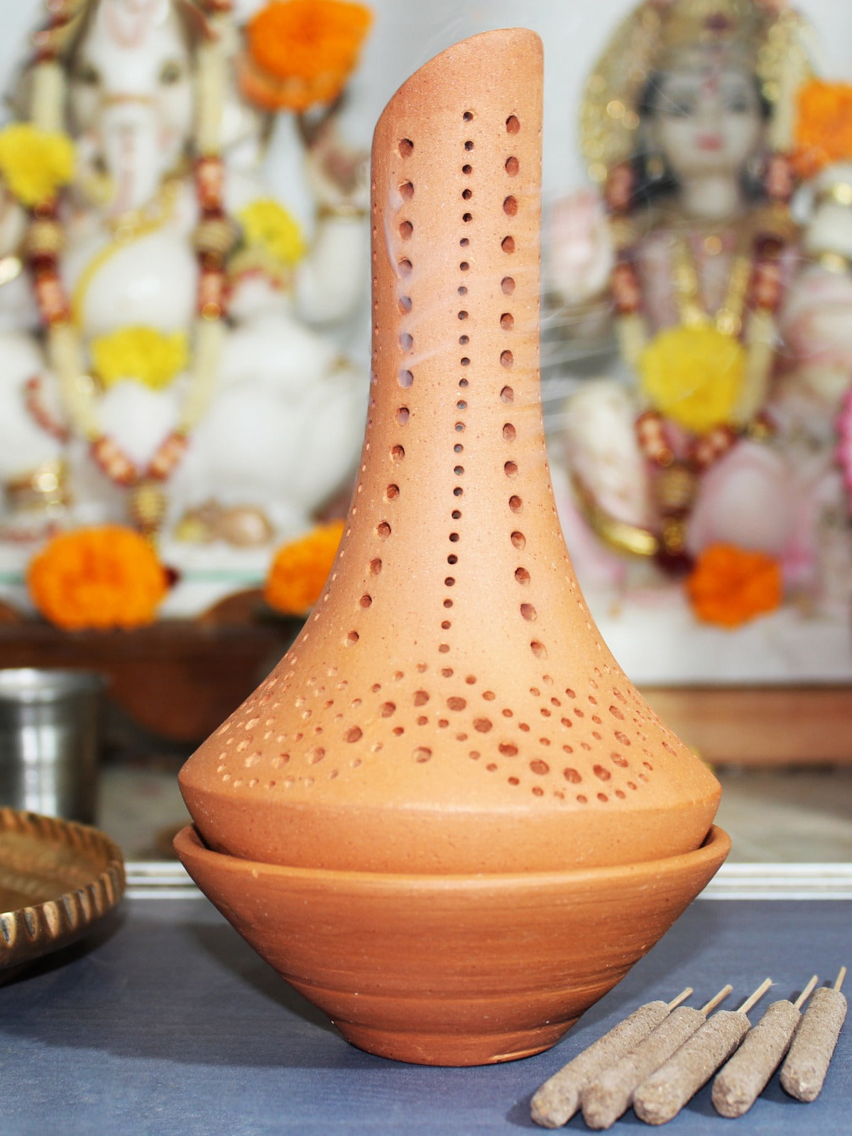 A terracotta incense stand with protective cover paired with 100 natural‑resin dhuna sticks. Each burns for around 45 minutes, creating a serene, long‑lasting fragrance. A refined, ready‑to‑use combo for homes, studios, and prayer corners.