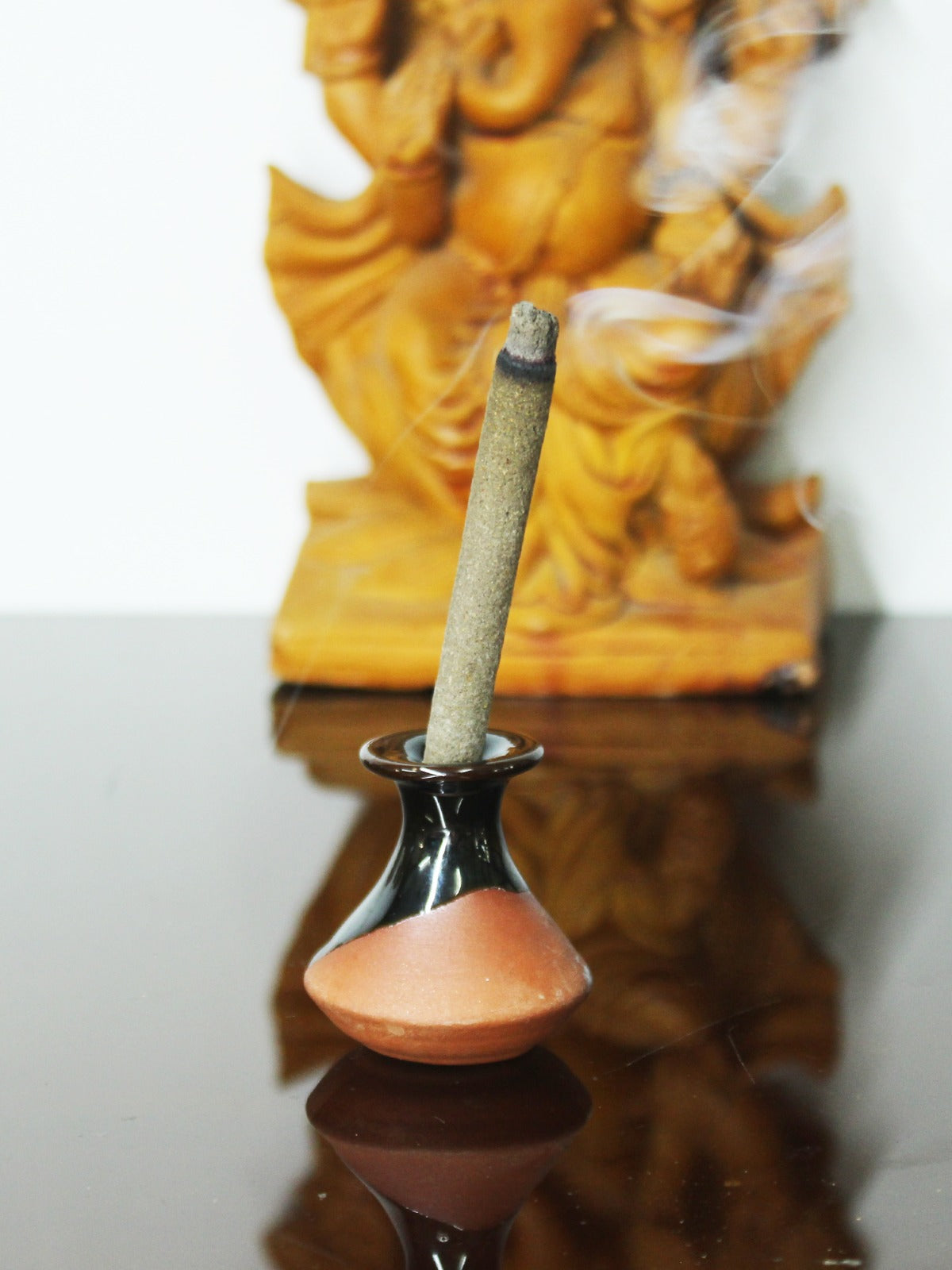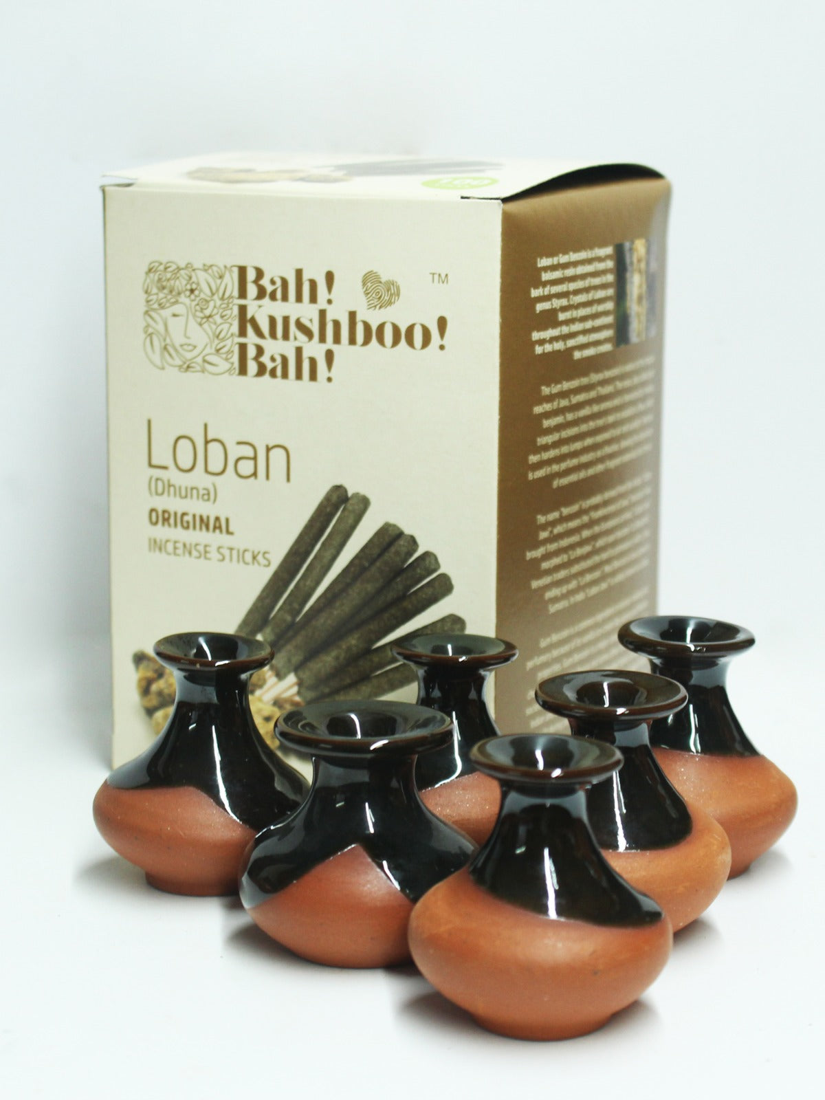Six miniature terracotta handi stands paired with 100 dhuna incense sticks. Ideal for spreading fragrance across rooms, they deliver a gentle, steady aroma for daily use stylish, functional, and handcrafted.