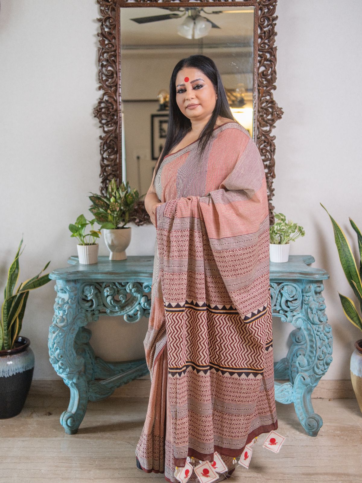 The Mridini Saree is an ode to the raw beauty of earth, featuring hand block-printed stripes in warm, brown tones. Crafted by skilled artisans, each stripe is meticulously stamped onto soft cotton, creating a harmonious play of natural hues and textures. The earthy palette speaks of grounded elegance while the breathable fabric ensures comfort and an effortless drape. A versatile piece that bridges tradition and modern ease, perfect for workdays, cultural gatherings, or quiet celebrations of craft.