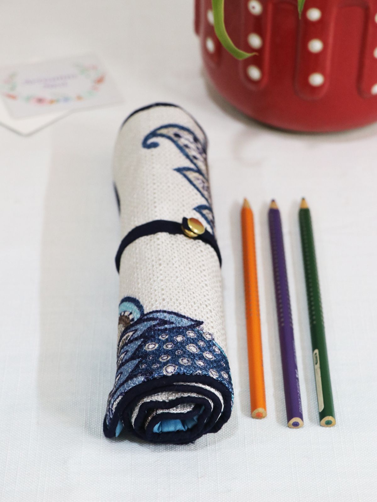 This versatile roll-up organizer serves students and artists with practical functionality. The compact design unfolds to accommodate writing instruments while a dedicated zip compartment secures smaller essentials like erasers, sharpeners, and accessories. Measuring 21cm x 41cm, it folds compactly for convenient portability without compromising storage capacity. The structured layout keeps supplies systematically arranged and readily accessible. Handwash with mild detergent to maintain durability. Crafted in India with a distinctive blue finish. Each piece features a unique design.