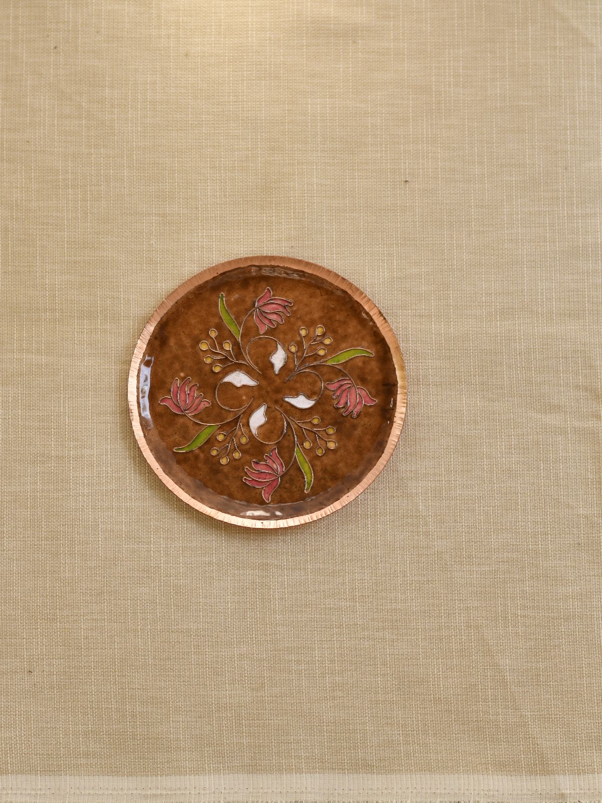 Elevate your décor with this exquisite lotus-themed wall plate, a masterpiece of traditional copper enameling craftsmanship. Handcrafted by skilled artisans from Maharashtra's western ghats, each piece features a pure copper base adorned with vibrant glass enamel detailing. The ancient technique involves fusing powdered glass onto copper at 700-900°C, creating a luminous, durable finish. Beyond its aesthetic appeal, the enamel coating protects the copper from oxidation, ensuring lasting beauty and functionality. This decorative accent brings warmth and cultural richness to any interior space.