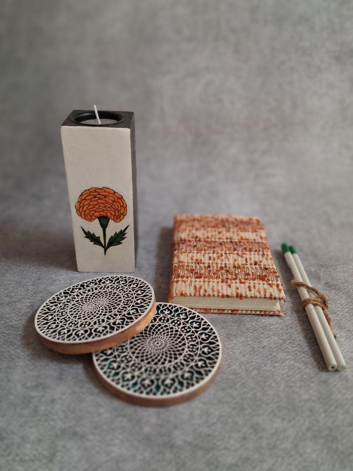 Artisanal craftsmanship defines this curated gift collection. Hand-painted miniature designs adorn meticulously sanded wooden candle holders, finished with protective varnish for lasting elegance. Complementary wooden coasters receive careful surface treatment and polishing to achieve a refined aesthetic. The accompanying diary features a sustainable fabric cover crafted from reclaimed textiles, paired with eco-conscious paper pages and recycled pencils embedded with plantable seed capsules—transforming everyday writing into an environmental contribution.