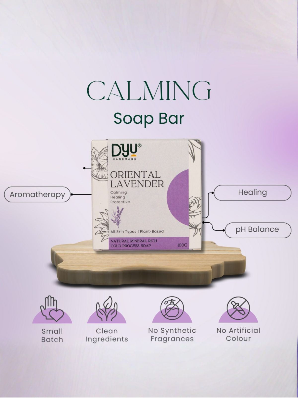 Unwind, soothe, and soften with DYU Oriental Lavender Cold Processed Soap—a handcrafted bath bar infused with lavender essential oil, alkanet root, coconut oil, and vitamin E to bring calm to your skin and serenity to your senses. Known for its calming and anti-inflammatory properties, Lavandula Angustifolia (lavender) helps reduce skin redness, ease irritation, and promote deeper sleep through its gentle floral scent. Alkanet root, a natural botanical, gives the soap its beautiful lavender tint while helping to even skin tone and reduce sensitivity. Cold-processed with extra virgin coconut oil, this bar provides a rich, creamy lather that cleanses without stripping your skin. Vitamin E enhances the formula by protecting and repairing the skin barrier making it a perfect choice for dry, sensitive, or stressed skin types. Free from sulfates, parabens, and artificial fragrance, this soap bar is as clean as it is calming. Whether you're starting your day with a moment of peace or winding down for the night, DYU Lavender Soap brings a touch of luxury and aromatherapy to your everyday.