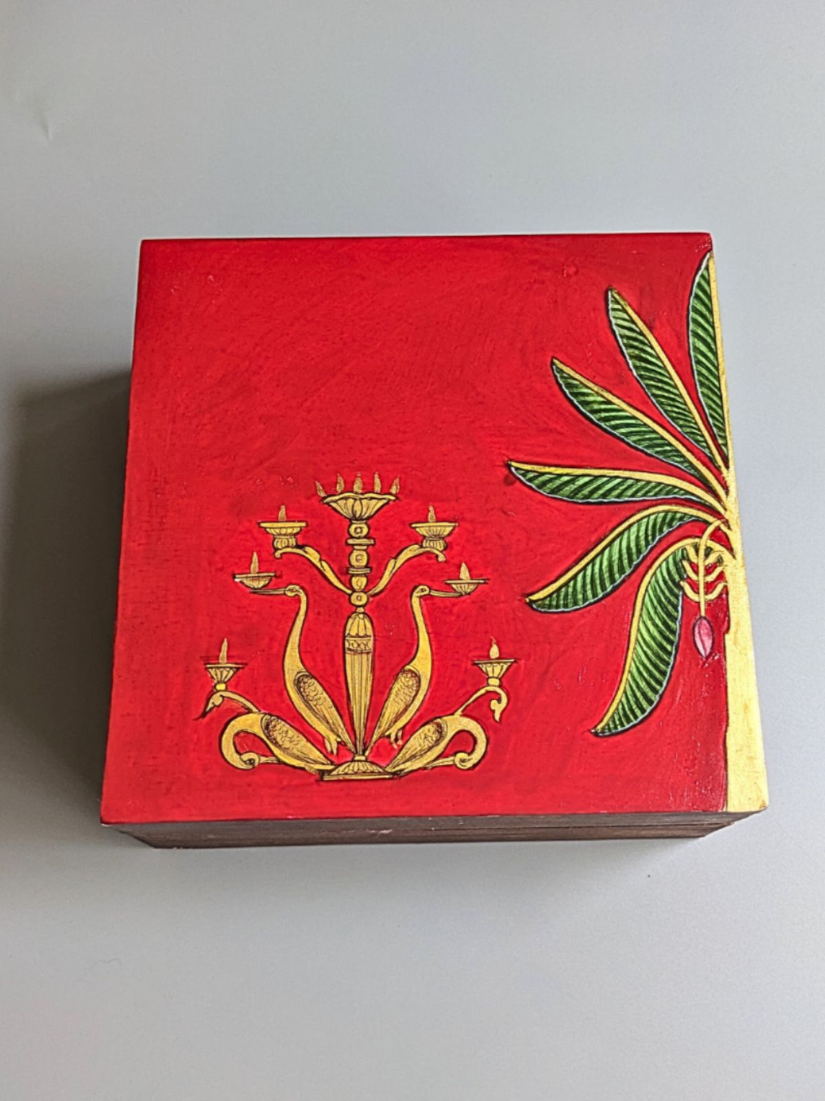 • In The Box: 1 Hand Painted Wooden Box in Pichwari Style of Art (L 9 X W 9 X H 1.5 Inches) | 1 Large Carved Wooden Tea Light | Set of 2 Brass Diyas.