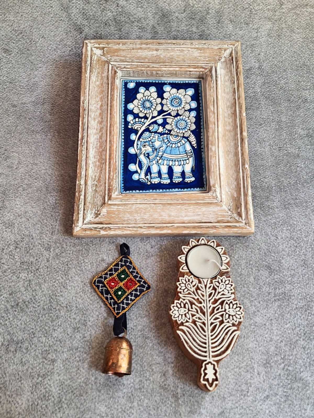This artisanal wall decor piece showcases traditional craftsmanship through multiple techniques. The wooden frame receives a white antique finish, while skilled artisans hand-paint intricate Kalamkari designs on the wooden base. Copper elements are meticulously shaped and formed into decorative bell accents, complemented by embroidered fabric detailing. A 6-inch wooden block features a carved cavity designed to accommodate a tea light candle, with expert sanding and polishing delivering a refined, luminous finish. Complete with mounting hardware, this handcrafted piece merges functional design with decorative artistry, bringing warmth and cultural authenticity to any interior space.