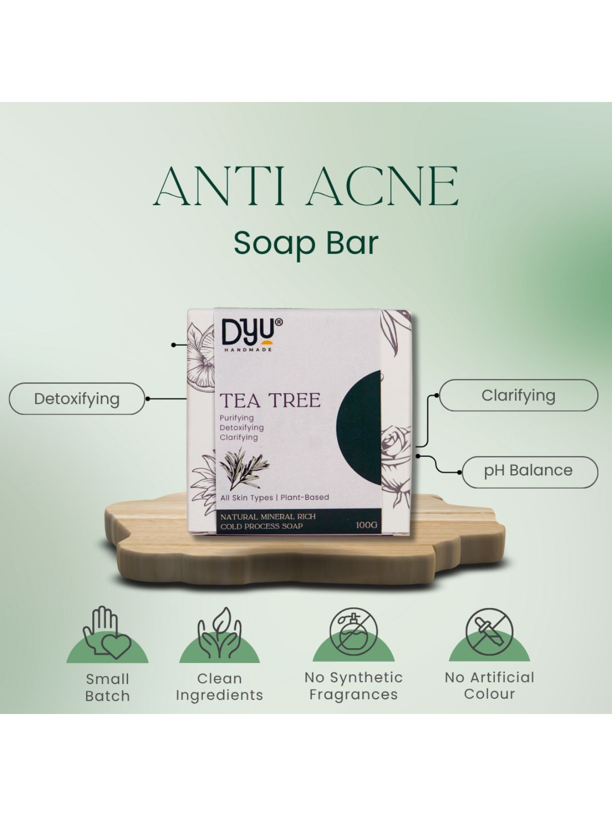 Balance, detox, and breathe easy with DYU Tea Tree & French Green Clay Cold Processed Soap—a handmade, skin-purifying bar designed for oily, acne-prone, and congested skin types. Infused with pure tea tree essential oil, this bar helps fight breakouts and body acne with its natural antibacterial properties making it perfect for areas like the back, chest, and shoulders. French green clay draws out impurities, reduces excess sebum, and gently exfoliates to reveal smoother, clearer skin. A base of cold-processed coconut and olive oils delivers a rich, non-drying lather that respects your skin’s natural barrier, while vitamin E helps calm inflammation and supports healing. The result? A skin-soothing bar that tackles blemishes while keeping your skin soft and hydrated. With no sulfates, parabens, or synthetic additives, this bar is your go-to for refreshing, clarifying daily care grounded in nature, perfected by purpose.