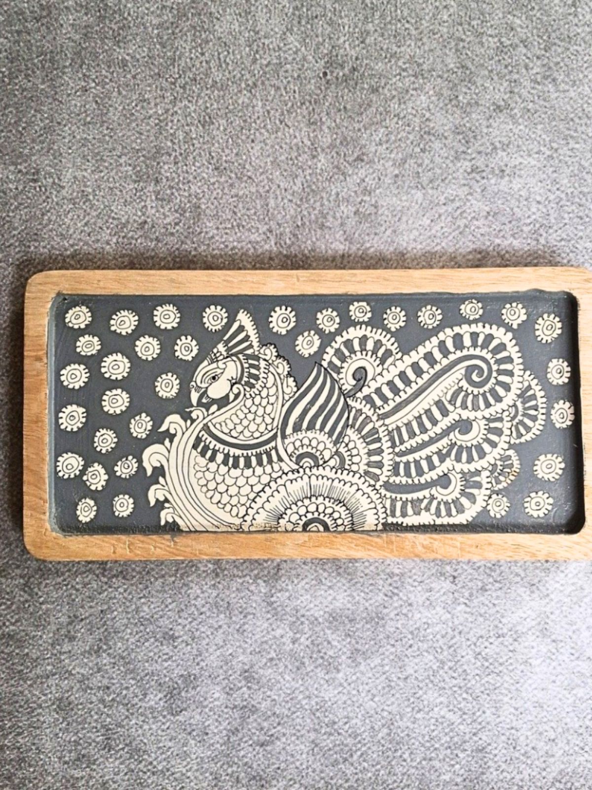 • In The Box: 1 Hand Painted Kalamkari Wooden Tray (L 12 x W 6 x H 1 inches) | 1 Kachchh Copper Bell Hanging | 1 Carved Wooden Tea Light (4 inches)