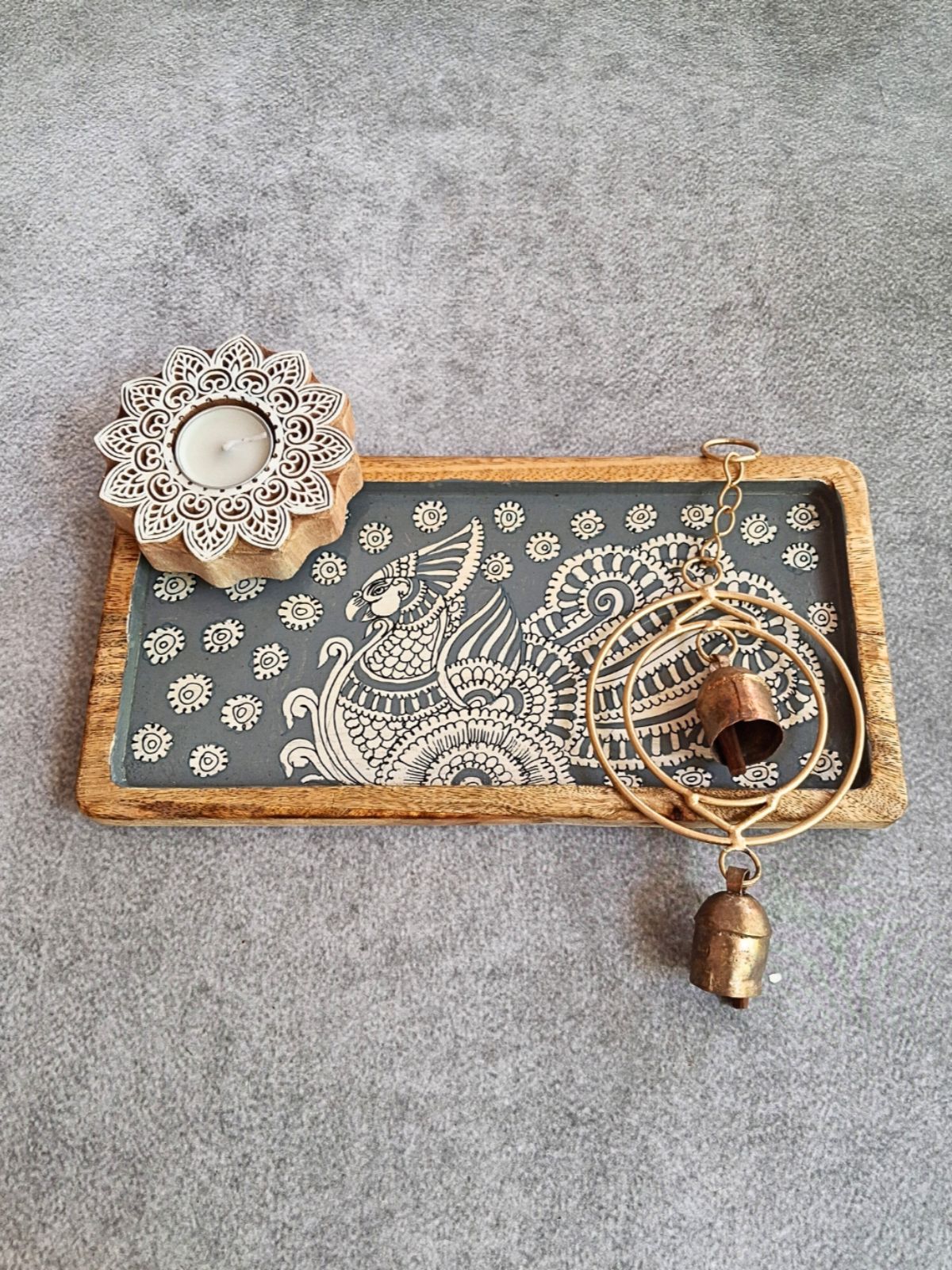 • In The Box: 1 Hand Painted Kalamkari Wooden Tray (L 12 x W 6 x H 1 inches) | 1 Kachchh Copper Bell Hanging | 1 Carved Wooden Tea Light (4 inches) | Comes in a Corrugated Gift Box Packing