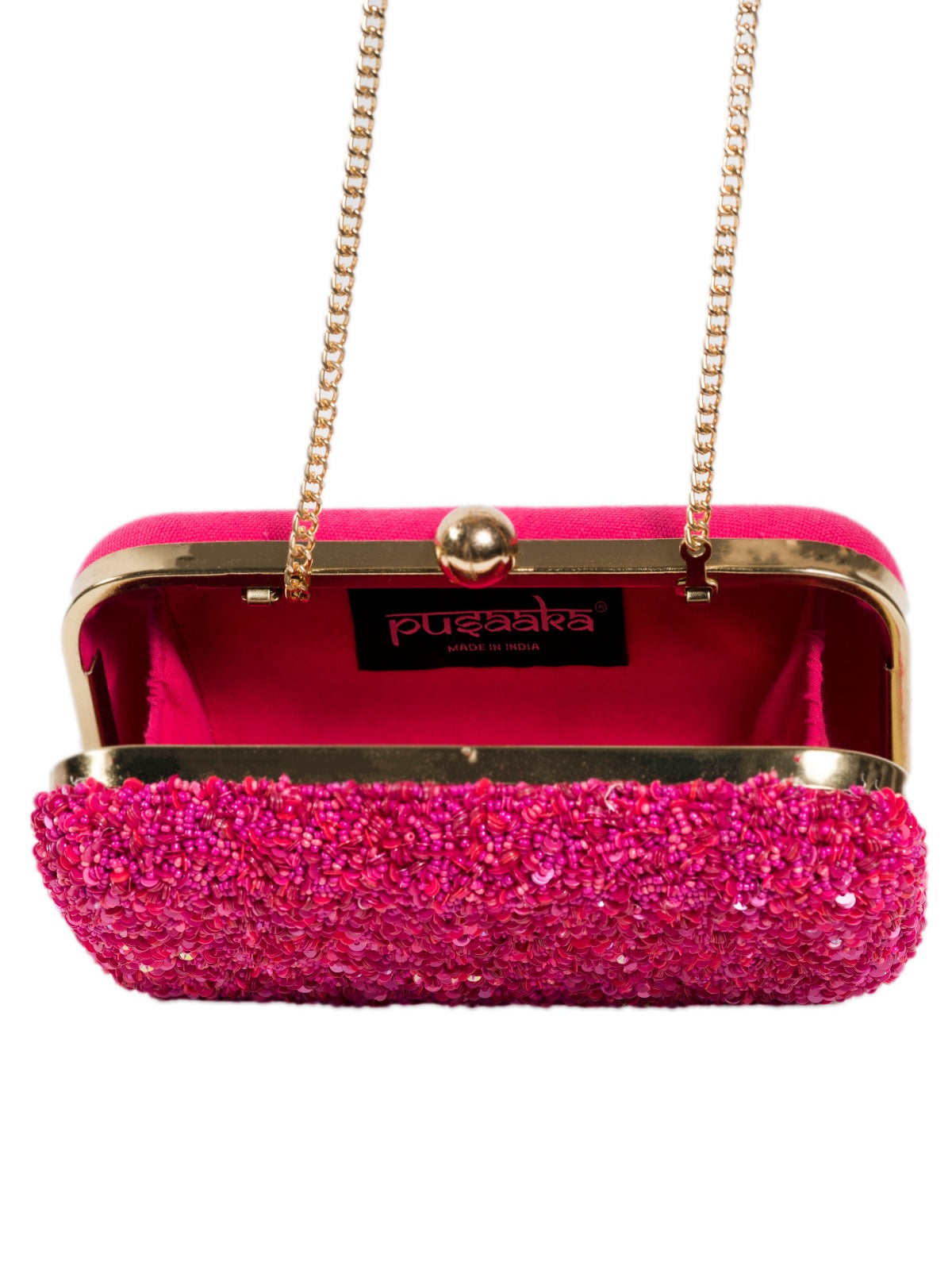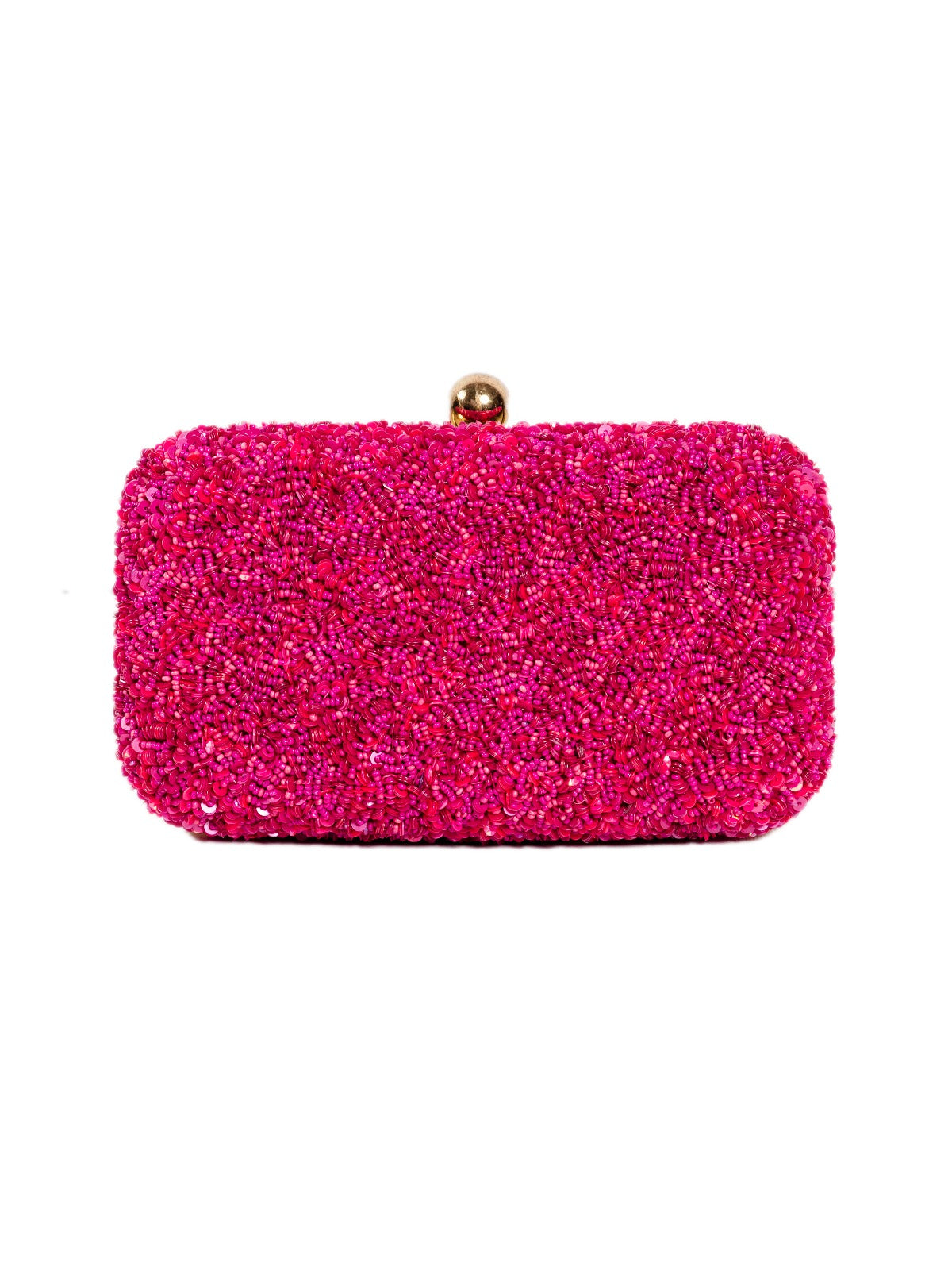 Make an unforgettable entrance with this stunning pink clutch, where thousands of hand-sewn beads create a mesmerizing shimmer effect. Crafted by skilled artisans from Uttar Pradesh, each bead is meticulously placed to create a uniform, luminescent surface that catches and reflects light from every angle. The vibrant fuchsia tone makes it an perfect statement piece for special occasions.