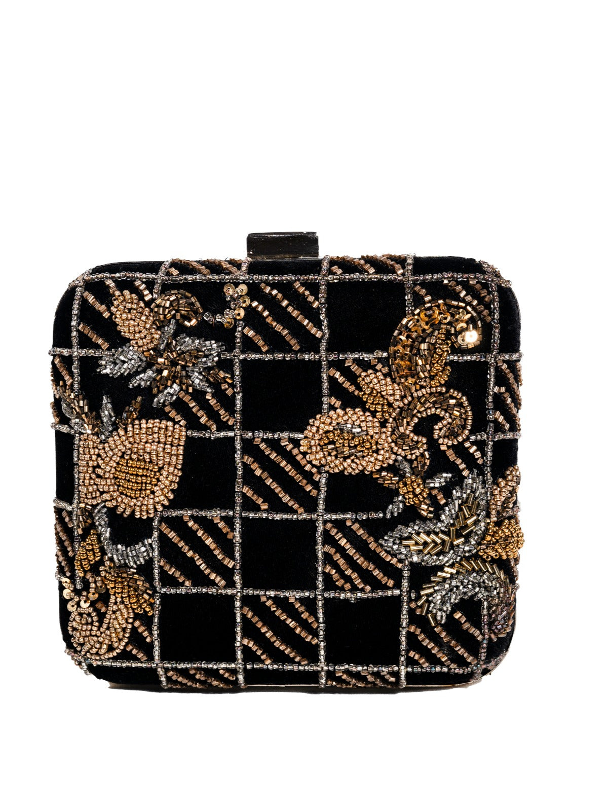 A stunning fusion of traditional craftsmanship and geometric modernism, this clutch features an intricate checkerboard pattern embellished with golden beadwork motifs. Each square is carefully decorated by artisans from Lucknow, creating an elegant play of light and shadow. The sophisticated black and gold combination makes it a versatile evening accessory.