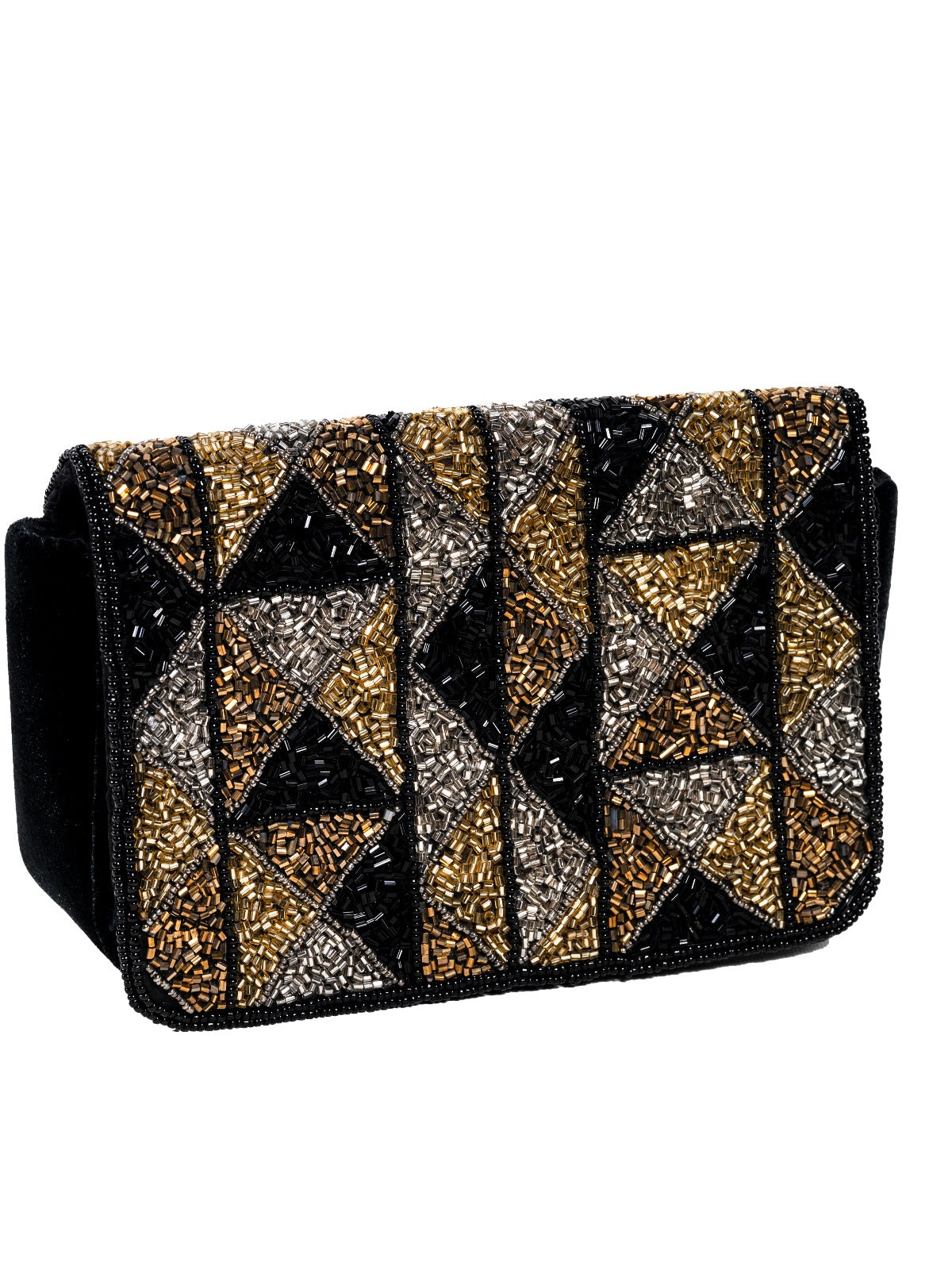A masterpiece of modern geometry meets traditional craft in this striking evening purse. Featuring a bold pattern of triangles and squares executed in golden and silver beads by artisans from Lucknow, this piece makes a contemporary statement while honoring classical beadwork techniques. The expandable design offers practical space without compromising on style.