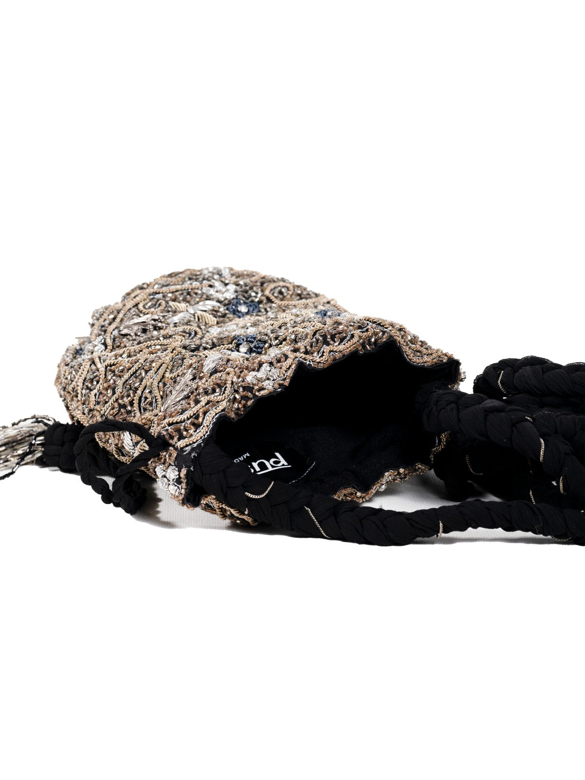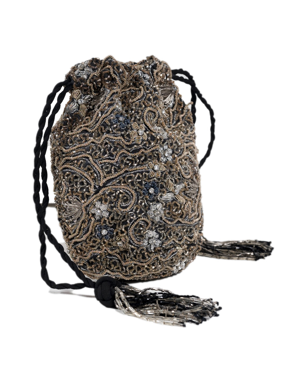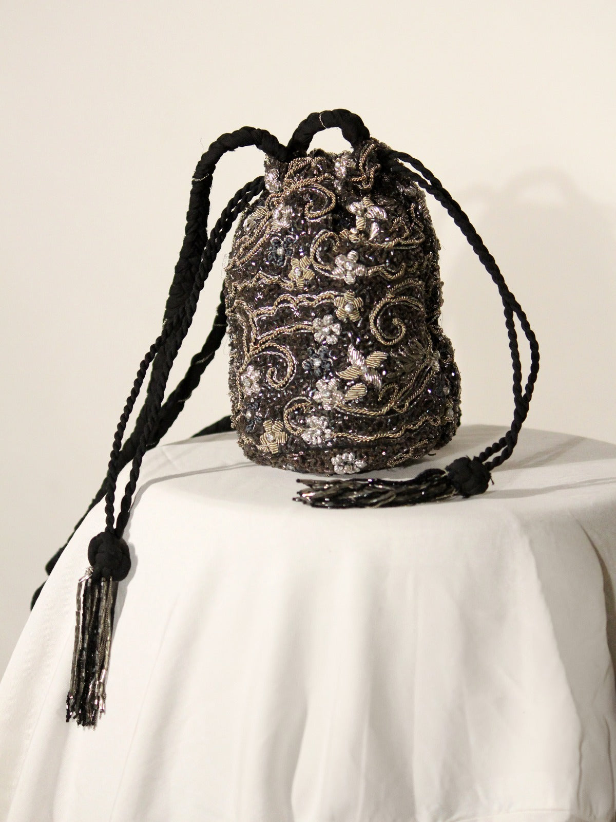 A masterpiece of intricate beadwork, this evening purse captures the ethereal beauty of twilight through layered silver beading. Artisans from Lucknow have created a mesmerizing lace-like pattern where each bead catches and reflects light, creating a sophisticated dimensional effect. The elongated silhouette is adorned with elegant beaded tassels that add movement and drama.