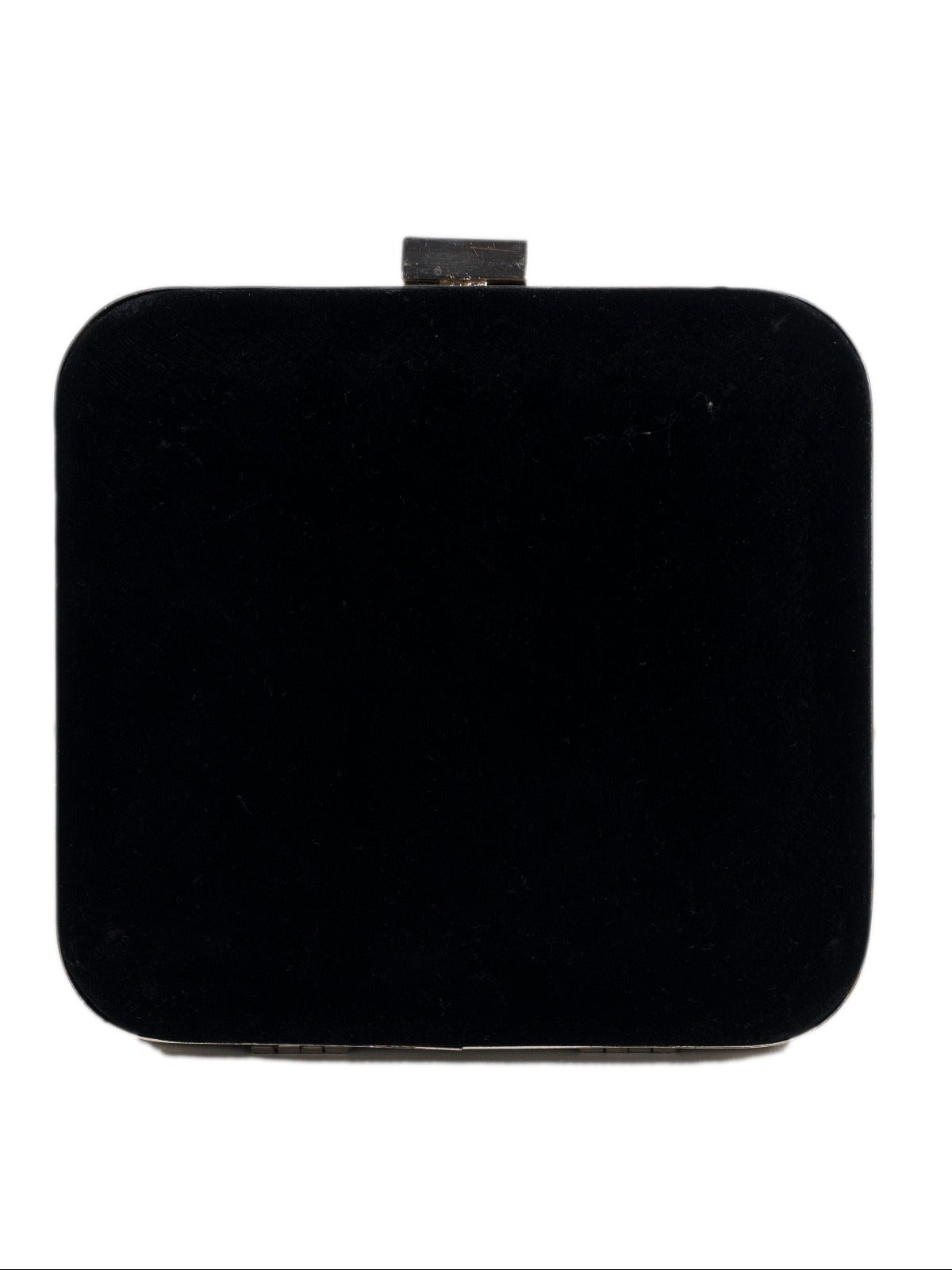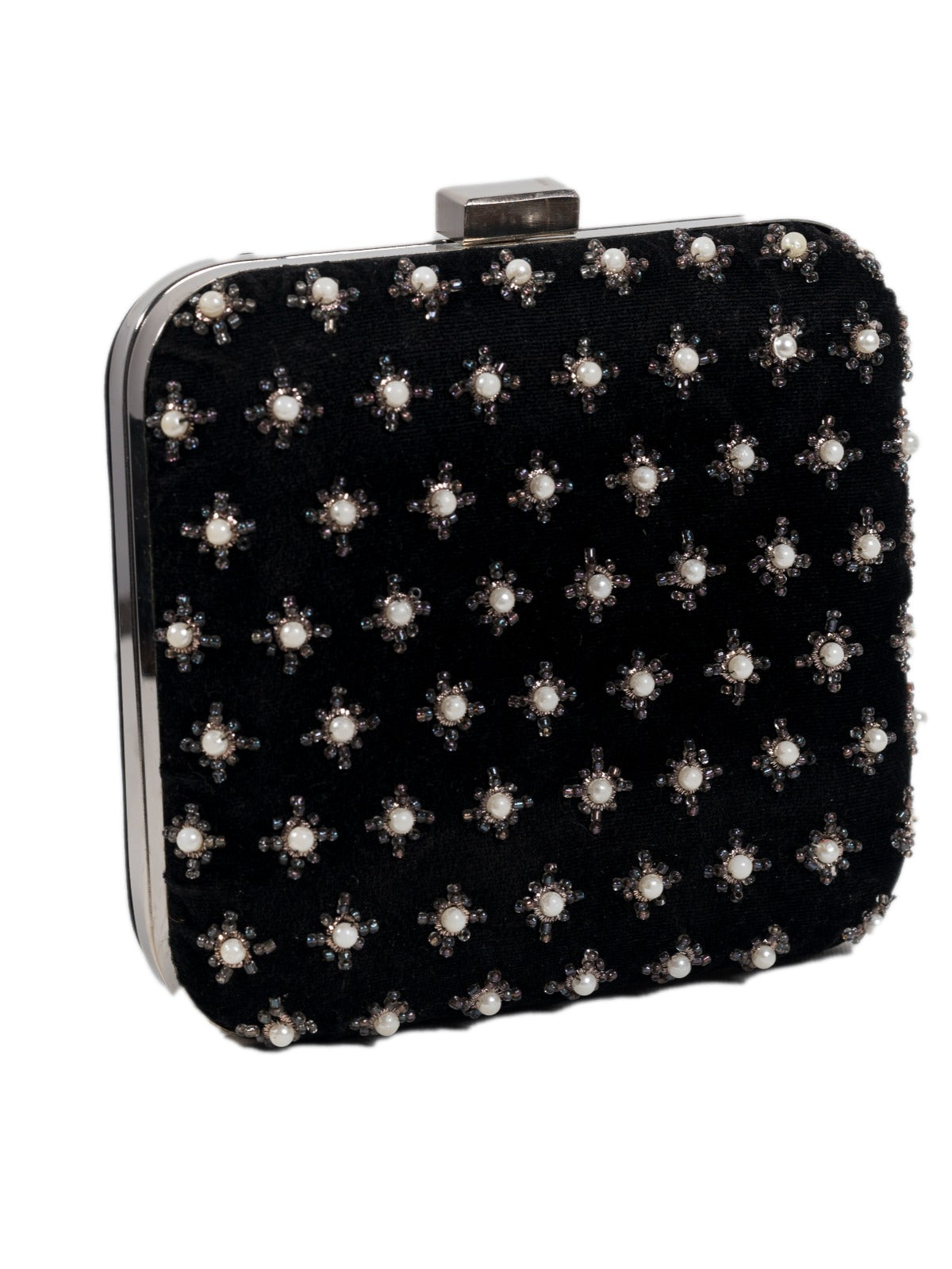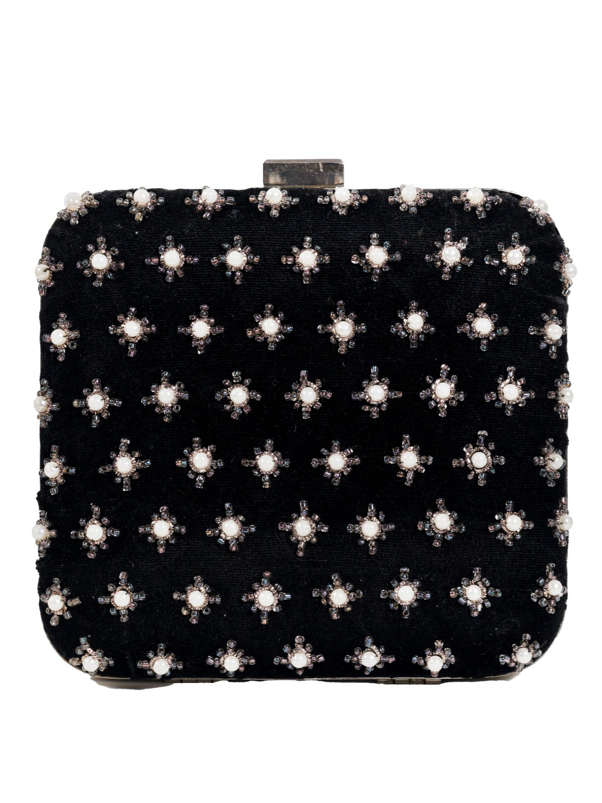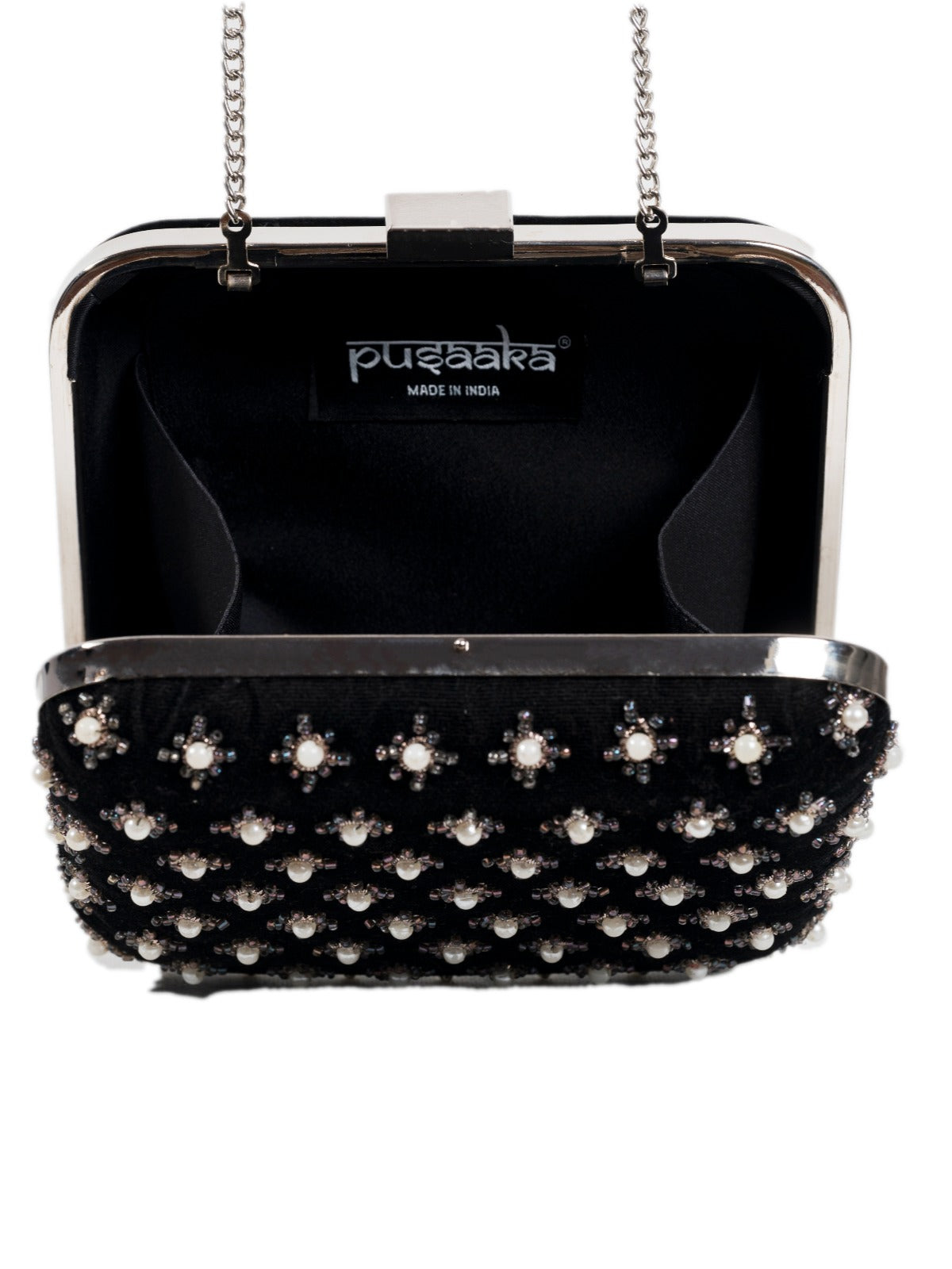 This striking clutch showcases a mesmerizing pattern of star-like beadwork against rich black fabric. Each metallic bead is carefully placed by artisans from Agra to create a celestial pattern that sparkles with every movement. The rectangular silhouette offers clean lines that perfectly balance the elaborate beadwork.