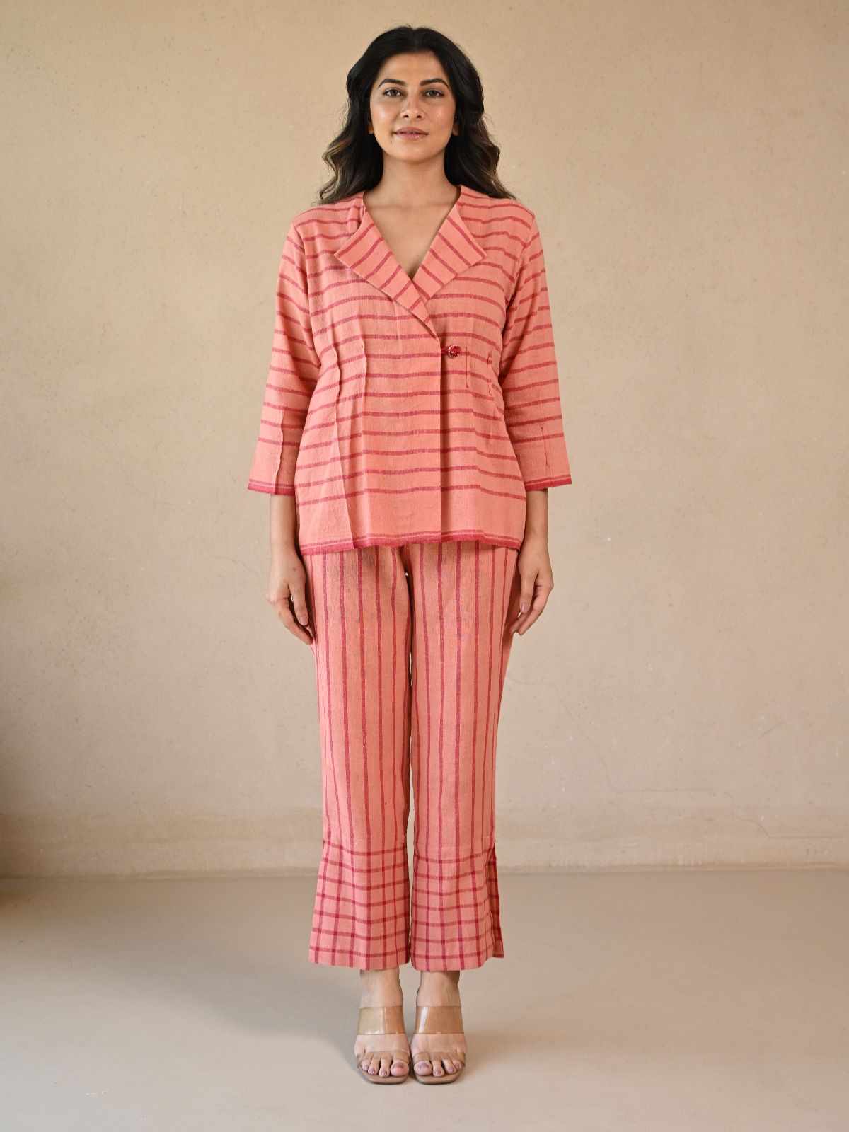 Azure jacket style tunic, crafted from handwoven Kala cotton in a rich, stripe peach hue. Designed with a zero-waste ethos, this tunic boasts a comfortable, embroidery button for effortless style. A part of our "Uncut" collection, it embodies our commitment to sustainable fashion. Please note, the nature of peach may result in flakes and runs, so we recommend pairing it with similar colored pant and accessories to prevent staining.