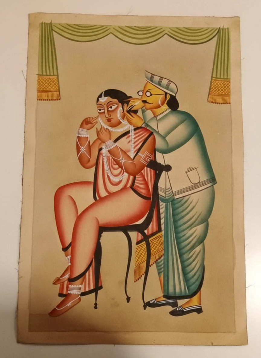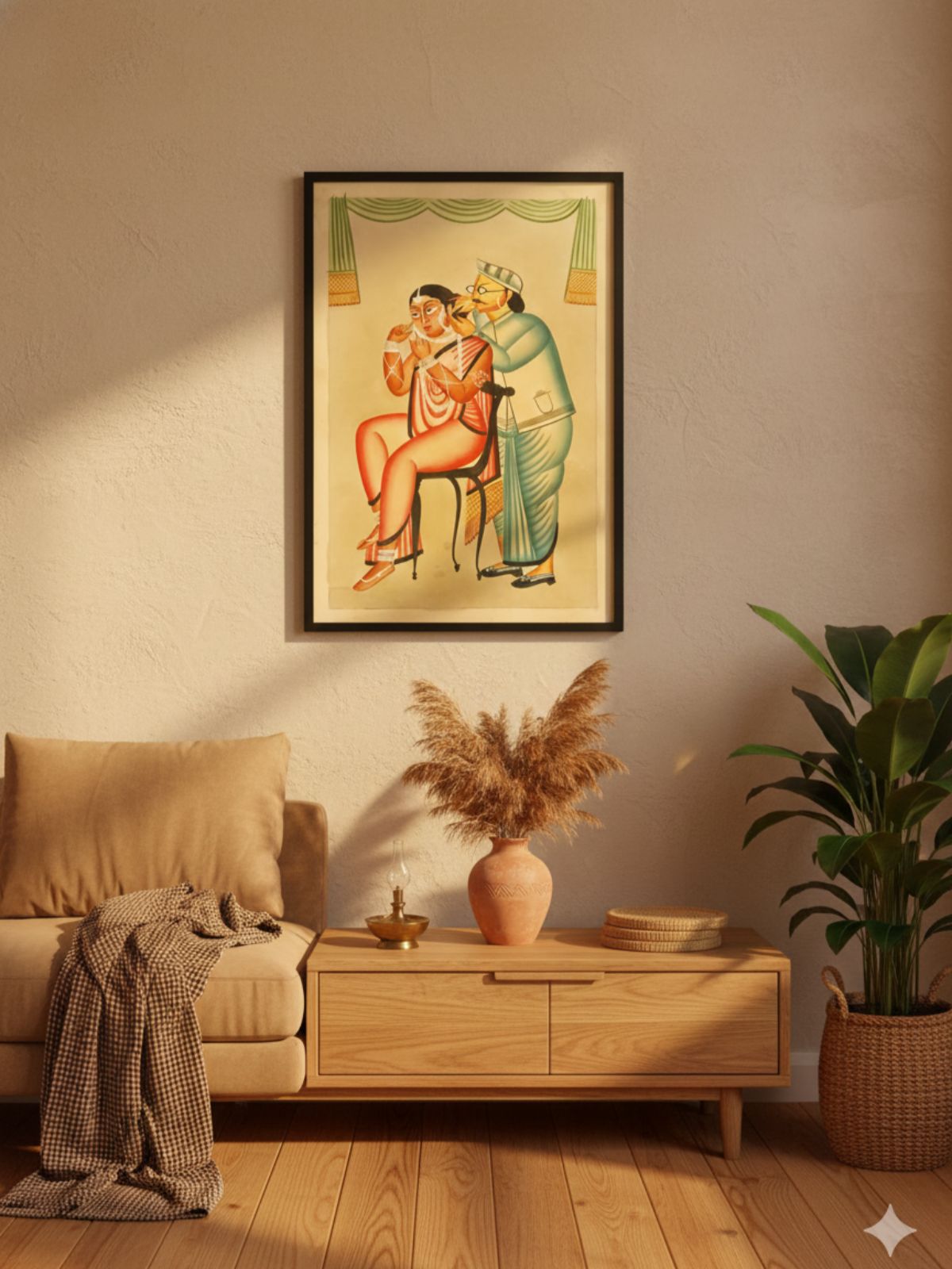 A charming glimpse into traditional Bengali life, this artwork shows Bibi adorning herself with jewelry before a festive moment. Hand-painted in Pattachitra style on natural grass art paper, the artist uses natural colors to celebrate beauty, grace and feminine ritual. Every detail feels alive through the delicate brushwork, making it a piece that adds culture and elegance to any space.