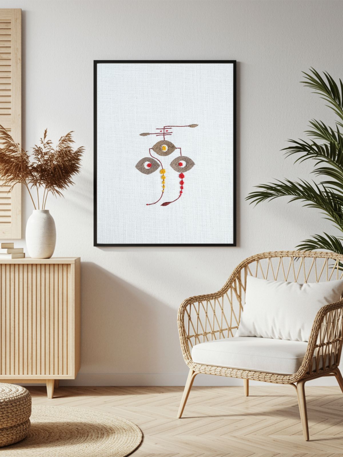 A modern tribute to Lord Ganesha, the Siddhipriya Ganesh Wall Art highlights his tilak and expressive eyes — emblems of wisdom, clarity, and protection. Crafted with intricate aari embroidery and luminous beadwork on cotton fabric, this unframed piece radiates quiet strength and grace. Compact yet impactful, it fits beautifully in living rooms or prayer corners. A contemporary reflection of devotion, it invites blessings and balance into your home.