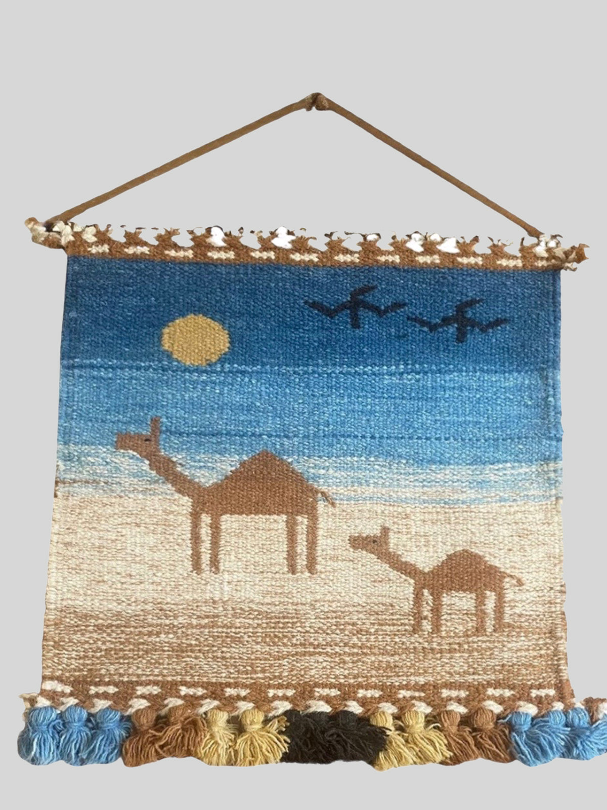 Textile Art -Earthy Elegance Textile Art, is a captivating portrayal of tranquillity in the heart of the desert. This small yet impactful piece features a pair of majestic camels gracefully navigating the sun-kissed sands. The carefully chosen earthy hues bring warmth to any space, while the intricate detailing captures the essence of these regal creatures in their natural habitat. Perfectly sized to adorn a cozy nook or side table, "Sands Embrace" infuses your surroundings with the timeless beauty of the desert. Cost of a single piece.