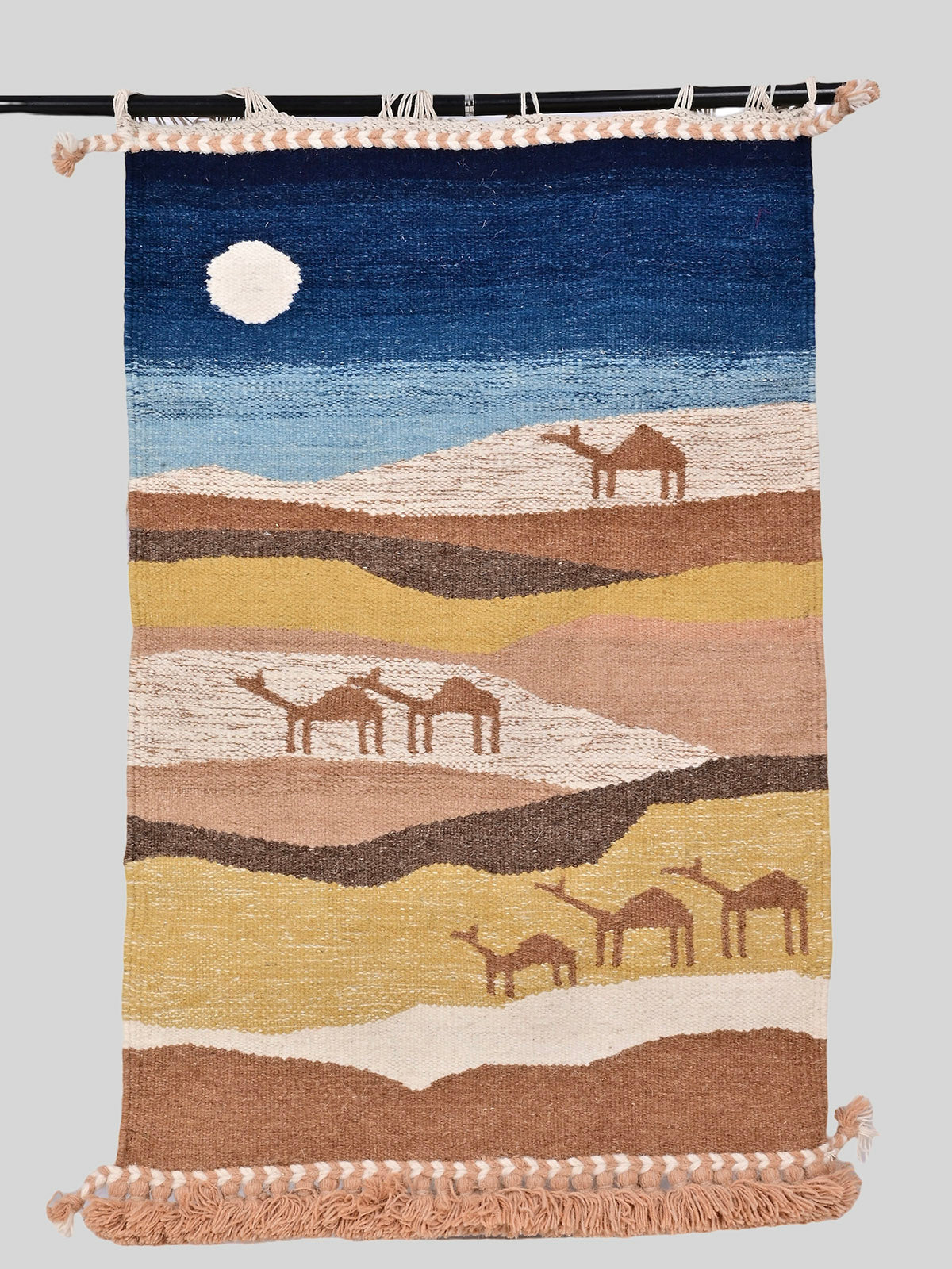 Introducing our "Golden Sands Symphony" Textile Art, a mesmerizing blend of earthy hues depicting the enchanting desert landscape. Warm tones mimic the moon's embrace on golden sands, while intricately woven camels traverse the textured terrain. This captivating piece brings the serenity of the desert into your space, evoking a sense of timeless beauty. Crafted with precision, its rich colors and tactile details invite you to touch and experience the allure of the arid landscape. Elevate your home with this stunning textile art, where the journey of camels through shifting dunes becomes a daily visual oasis.