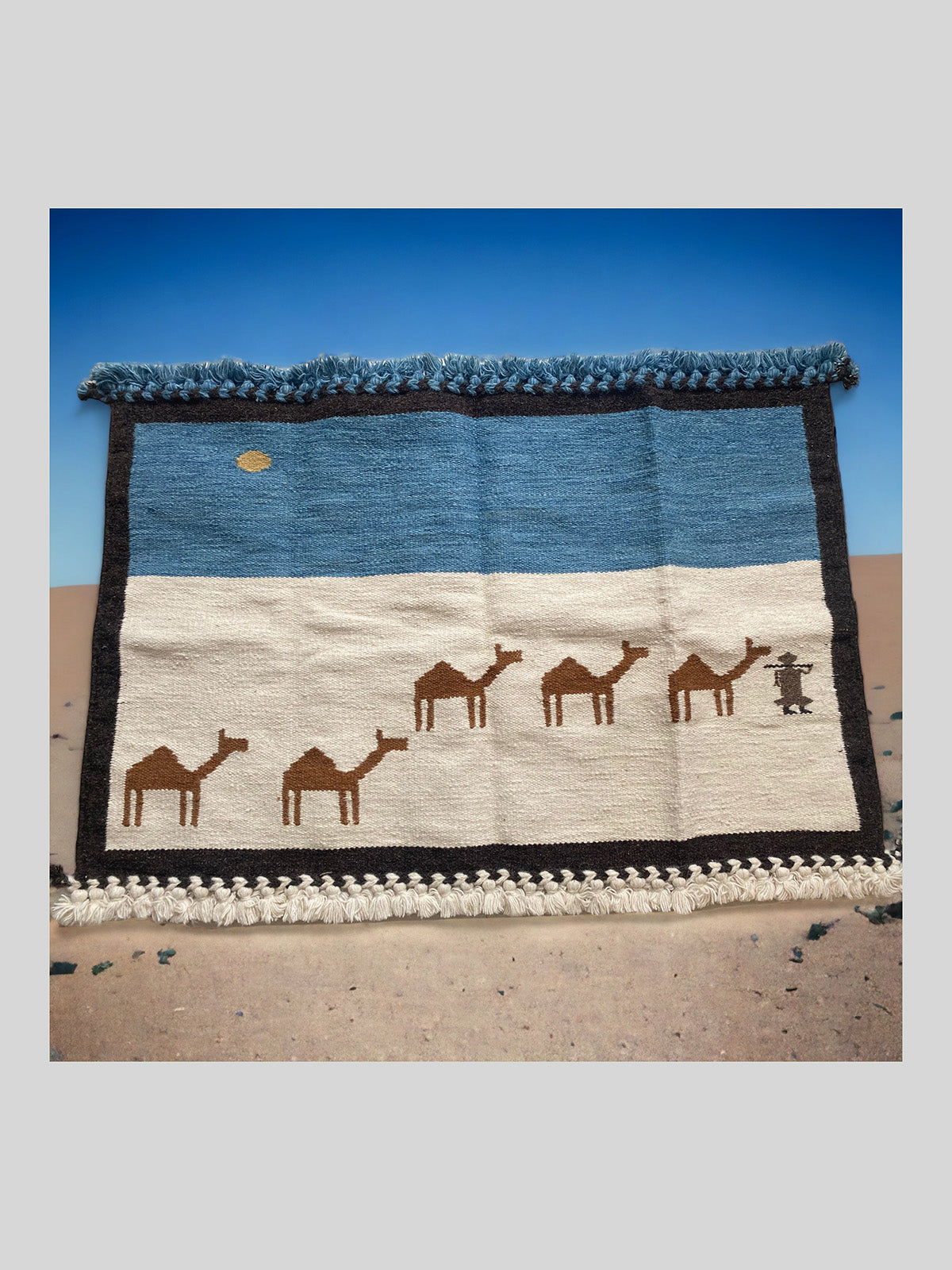 Textile art - Silent Nomads: A moonlit journey in the white desert! Step into the enchanting realm of the white desert with our captivating textile art. Thus, exquisite artwork captures the essence of a nomadic herdsman’s journey, as he guides his loyal camels through the ethereal white expanse!