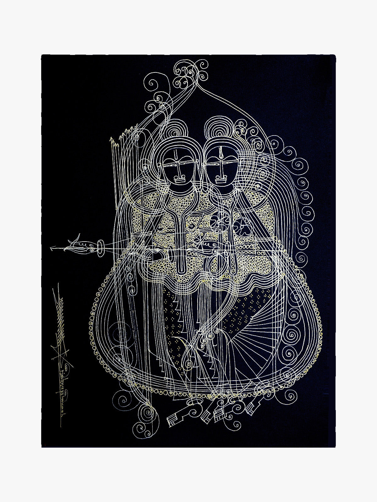 Discover the enchanting tradition of Surpur, a fading craft from Karnataka, through our exquisite line art depiction of Radha Krishna Crafted with meticulous attention to detail, each piece encapsulates the rich cultural heritage of India. Adorn your space with this exquisite black and white painting of Ram and Sita. Meticulously crafted, it captures their divine grace and eternal love. Perfect for any decor, this timeless piece brings a touch of spiritual elegance and tranquility to your home or office.