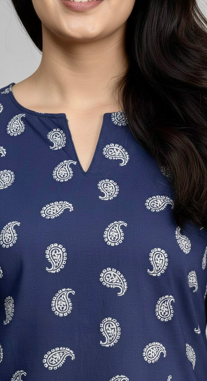 Crafted from 100% cotton for all-day comfort. This navy kurti features a classic paisley print and delicate white lace trimming along the sleeves and hem. Soft, breathable, and effortlessly elegant — perfect for workdays, errands, or relaxed evenings out.