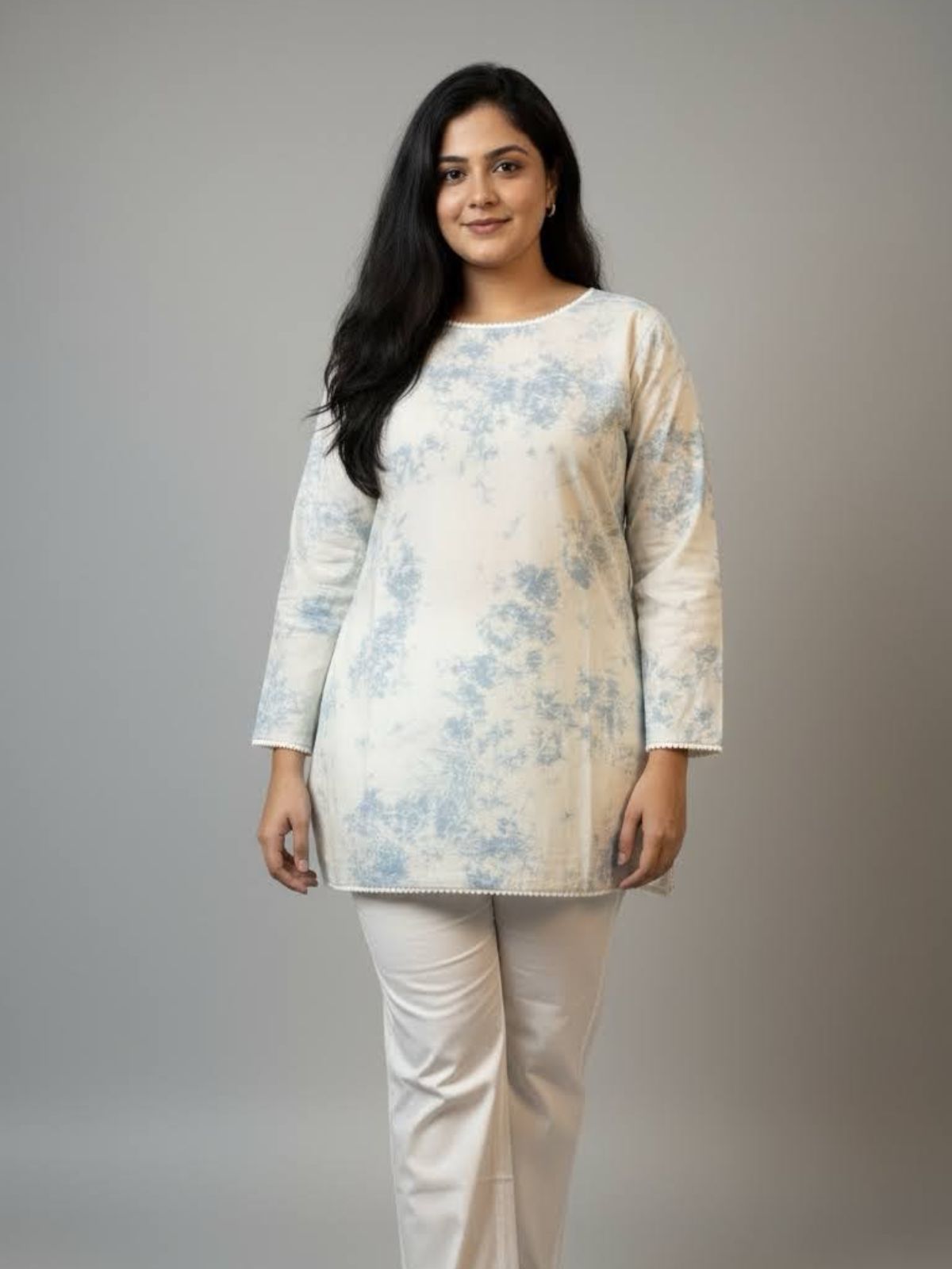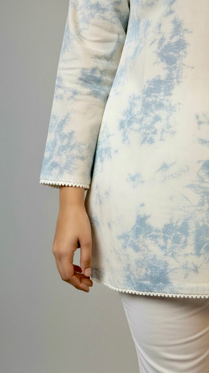 Crafted from 100% cotton for an airy, relaxed feel. This soft ivory-blue kurti features a cloud-like tie-dye print with subtle lace edging along the sleeves and hem. Light, minimal, and effortlessly chic — perfect for slow mornings and easy everyday wear.