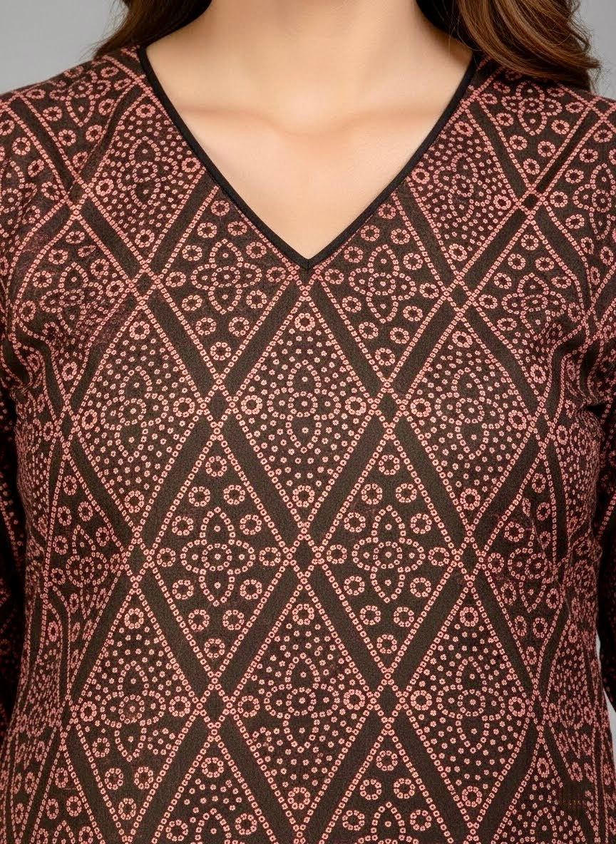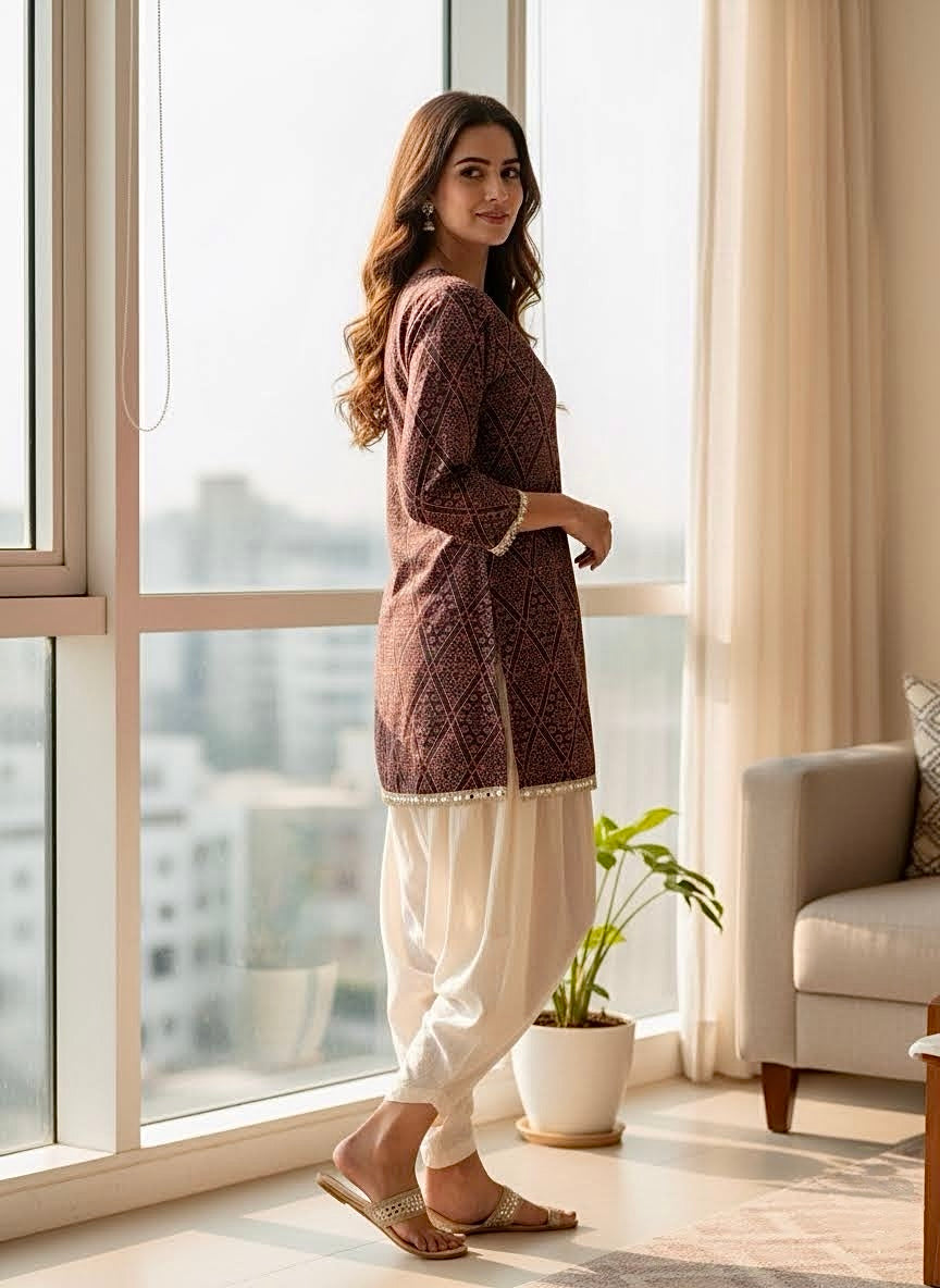 Crafted from breathable 100% cotton, this kurti features a rich maroon hue with a traditional geometric diamond print and a flattering V-neck. Delicate mirror-work lace on the cuffs and hem adds a beautiful, festive glow. This straight-cut piece is lightweight and elegant, perfect for illuminating any special occasion.