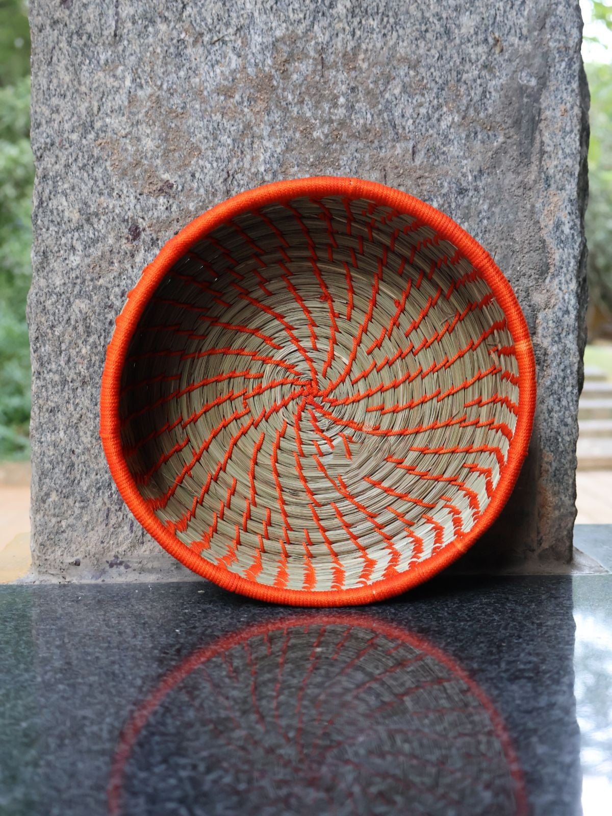 A pop of handcrafted color, this 8-inch Sabai tray features a striking orange weave contrasted with natural fibers. Ideal for serving, gifting, organizing or festive décor, it adds a joyful artisanal touch to modern homes. Lightweight and breathable, it adapts beautifully to living rooms, dining spaces and work desks.