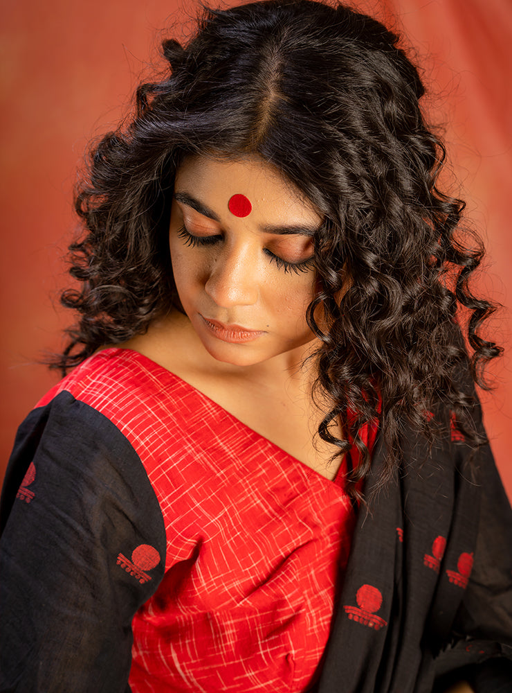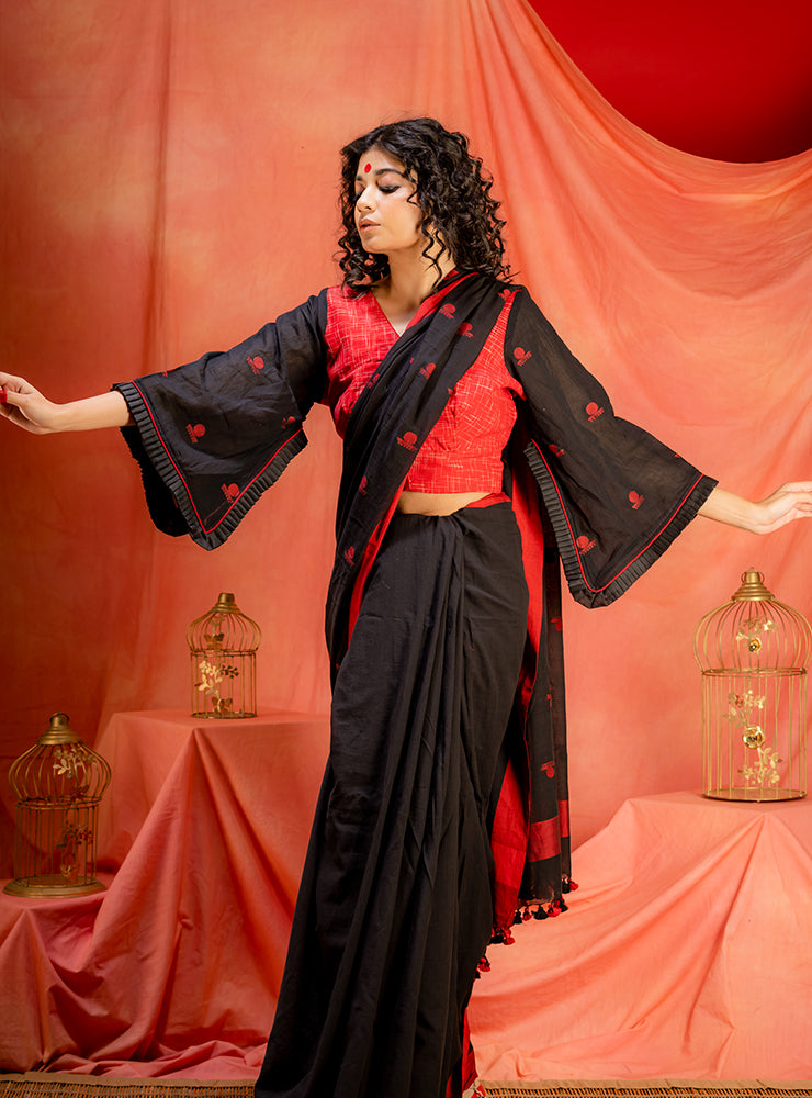 Embrace the allure of this Jamdani FlaRed Sleeves Blouse, crafted in the signature bindi Jamdani fabric. Dramatic flared sleeves adorned with playful frills, adding a touch of whimsy to your ensemble. Experience timeless elegance with a modern twist in this captivating piece.