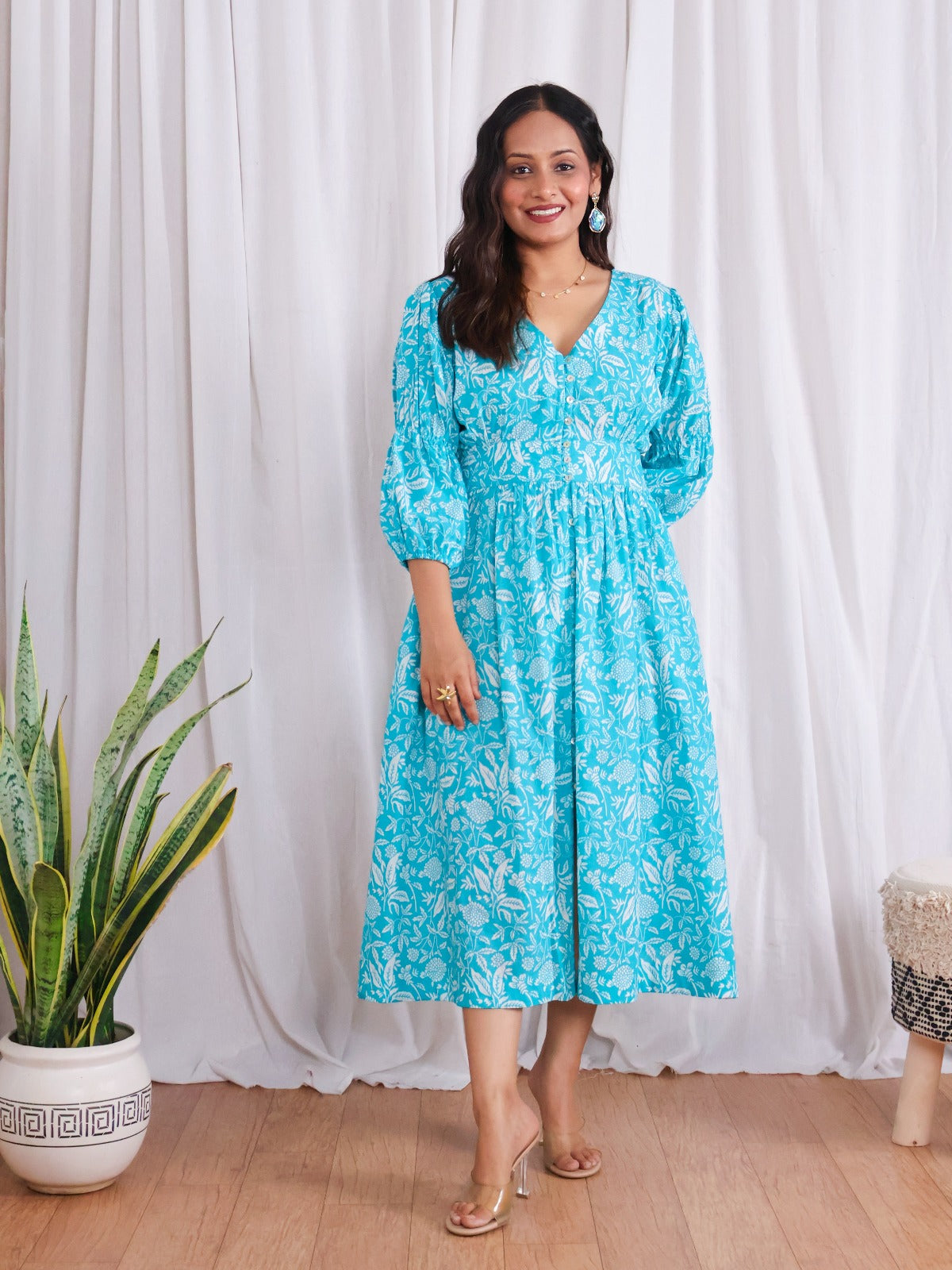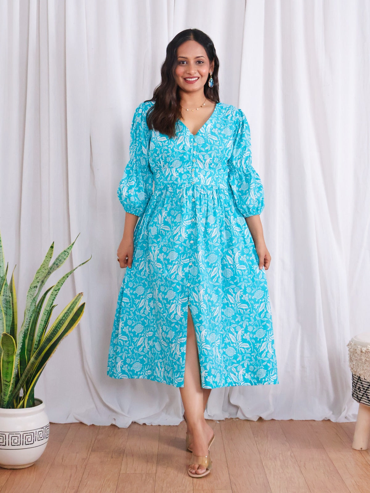 Cut in pure cotton fabric, it features a V-neckline, functional button-down placket, smocked back, 3/4th puffed sleeves, and side pockets for ultimate comfort. Fun, flirty, and ultra-flattering. This is the kind of dress you throw on and instantly feel like summer - whether you’re heading to a picnic, a casual day out, brunch with friends, or dancing barefoot in the grass. The dress is stitched by our skilled artisans in Jaipur.