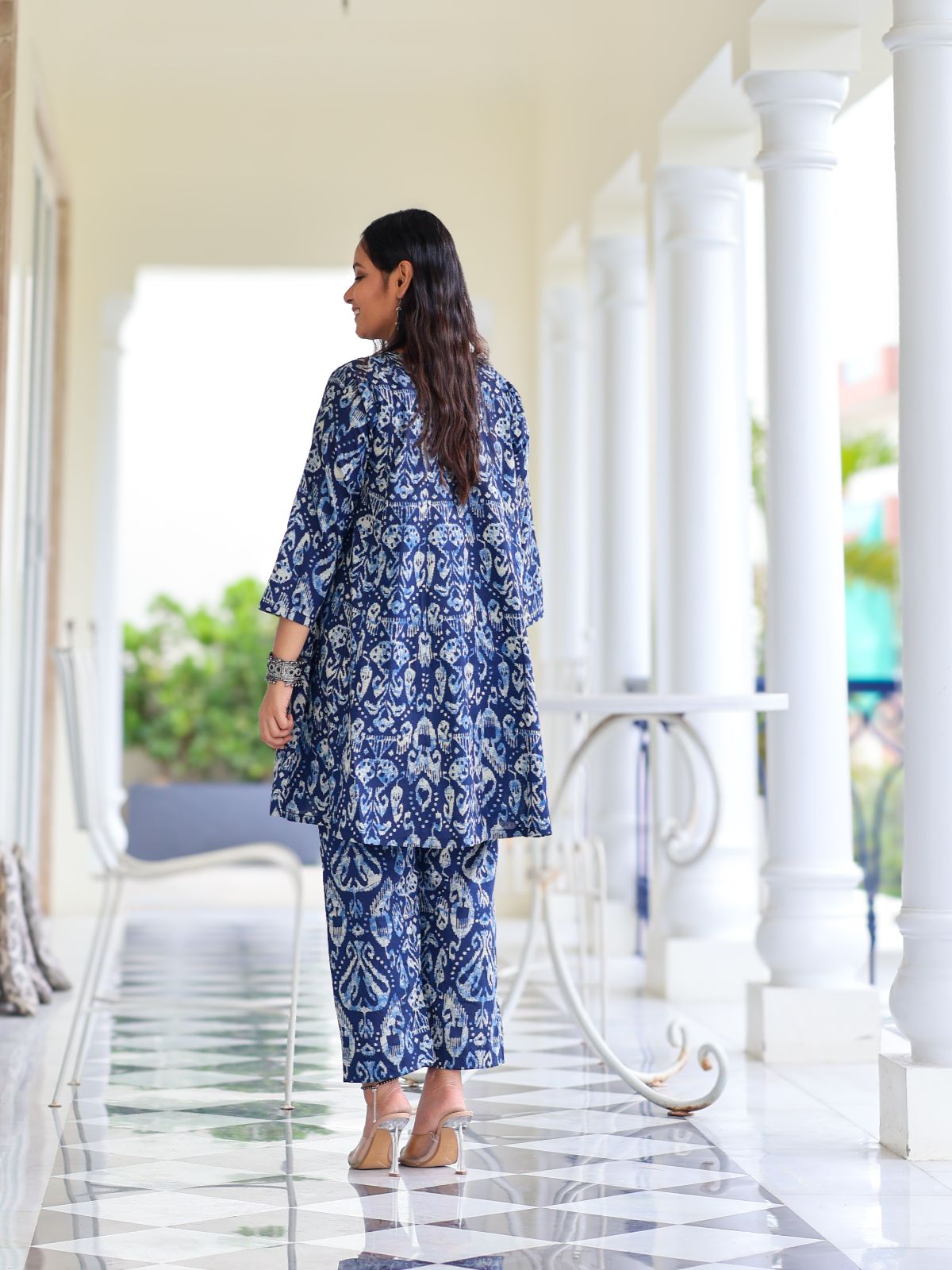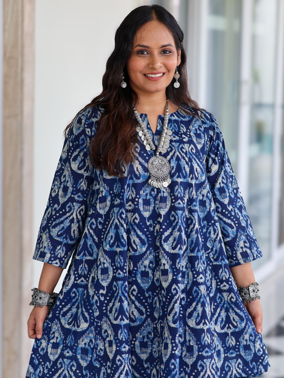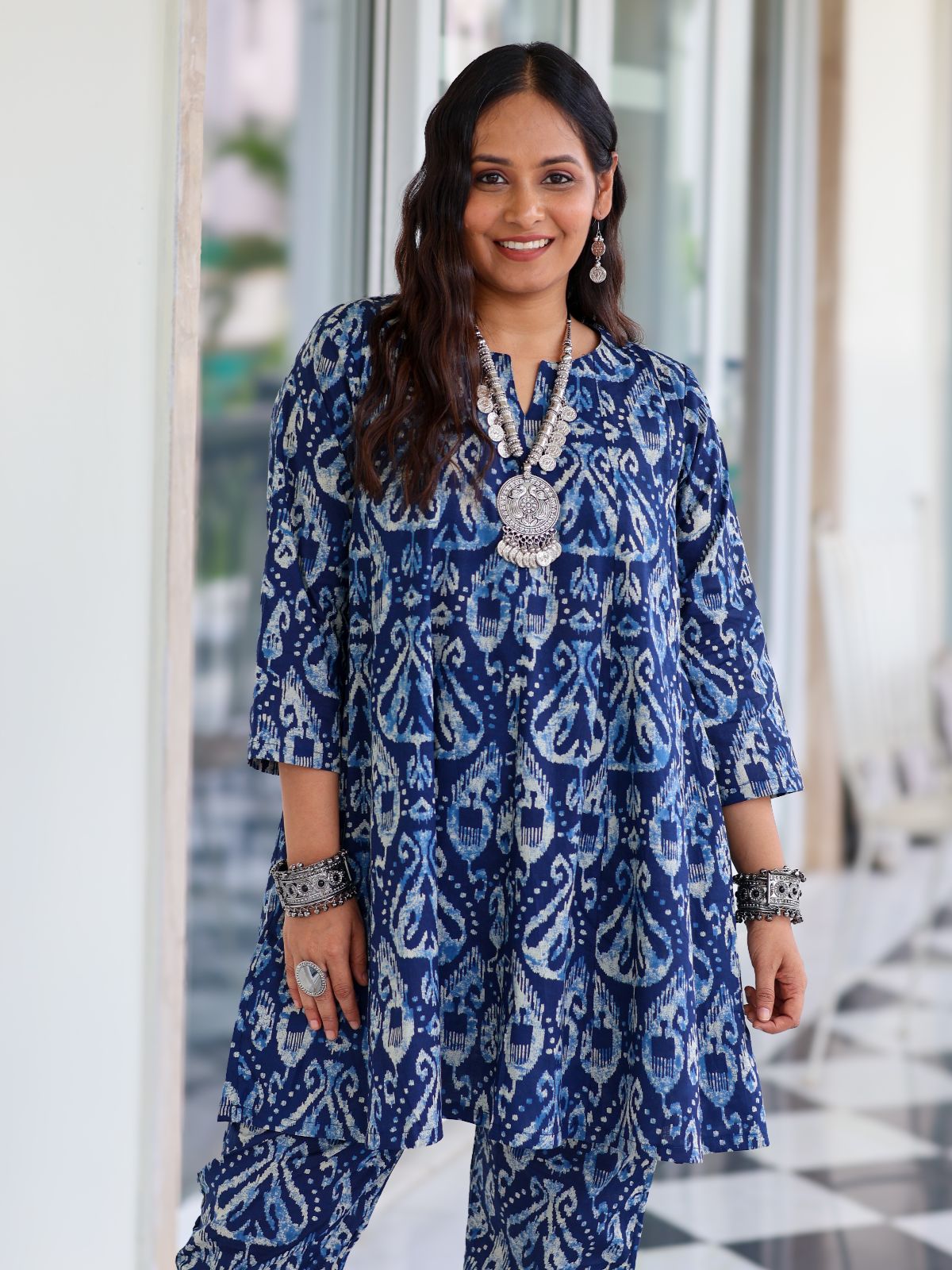 Kavya Blue Ikat Print Short Cotton Kurta Set